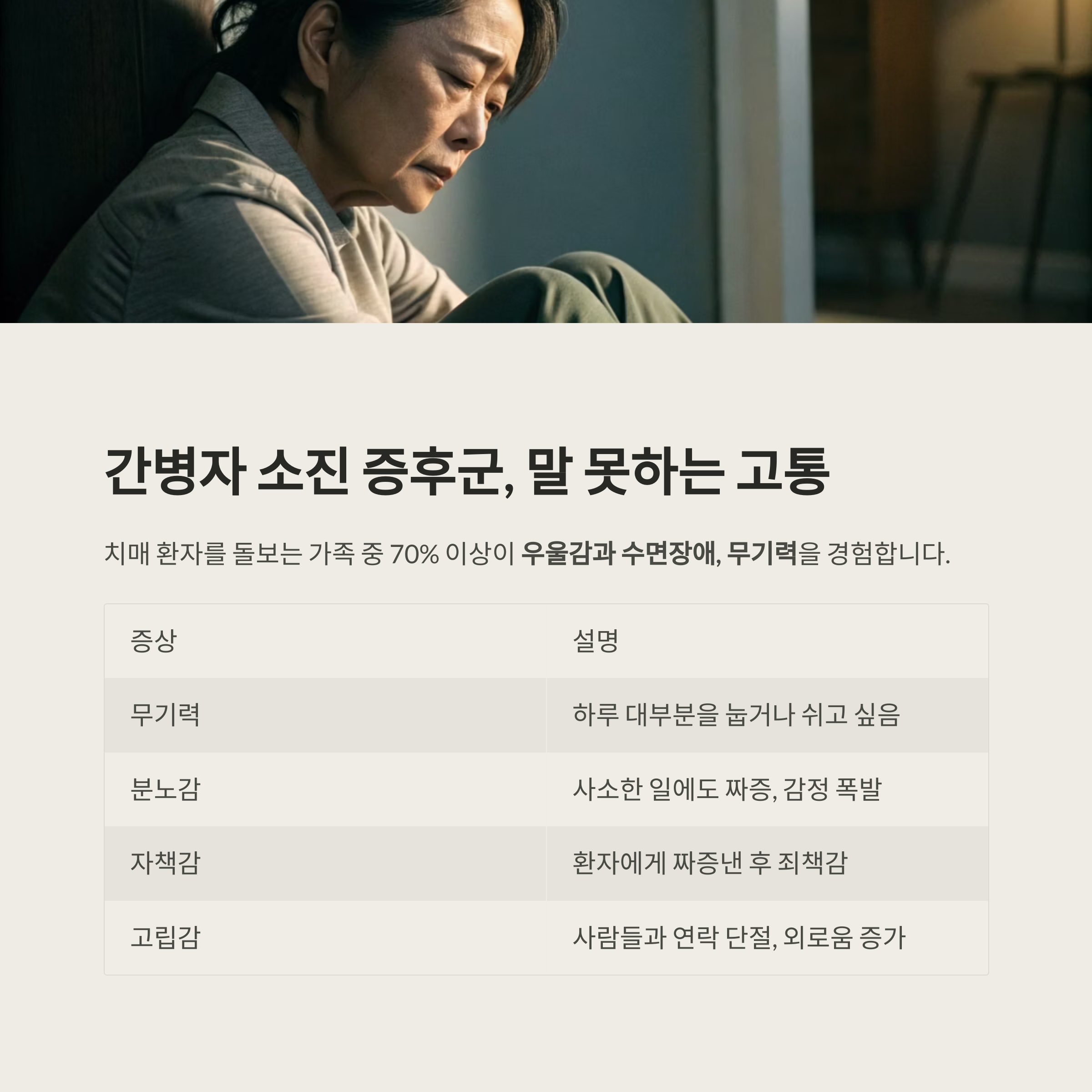 치매 환자를 돌보는 가족 중 70% 이상이 우울감과 수면장애, 무기력을 경험합니다.