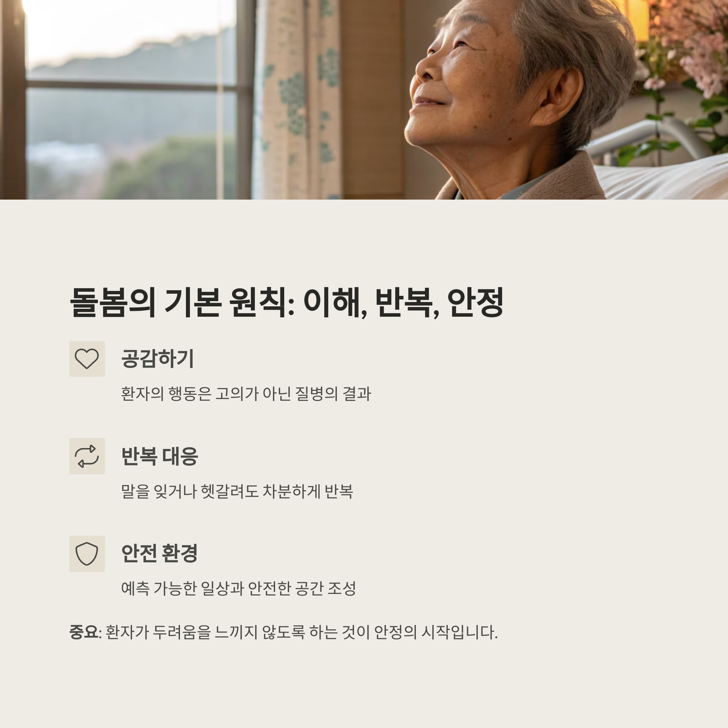 환자의 행동은 고의가 아닌 ‘질병에 의한 결과’이며, 비난보다 공감과 반복이 필요합니다.