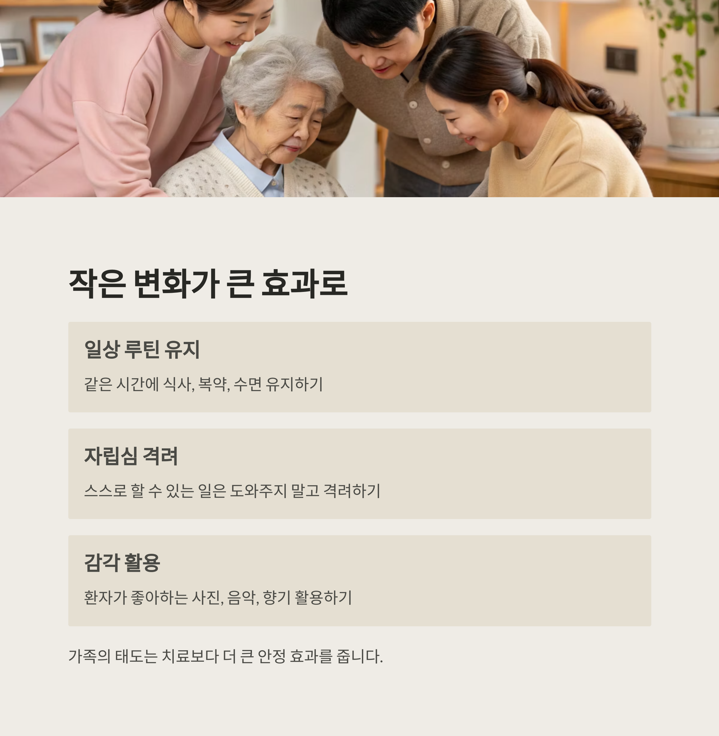 생활 속에서 가족이 실천할 수 있는 작은 돌봄 기술이 환자의 안정에 크게 기여할 수 있습니다.