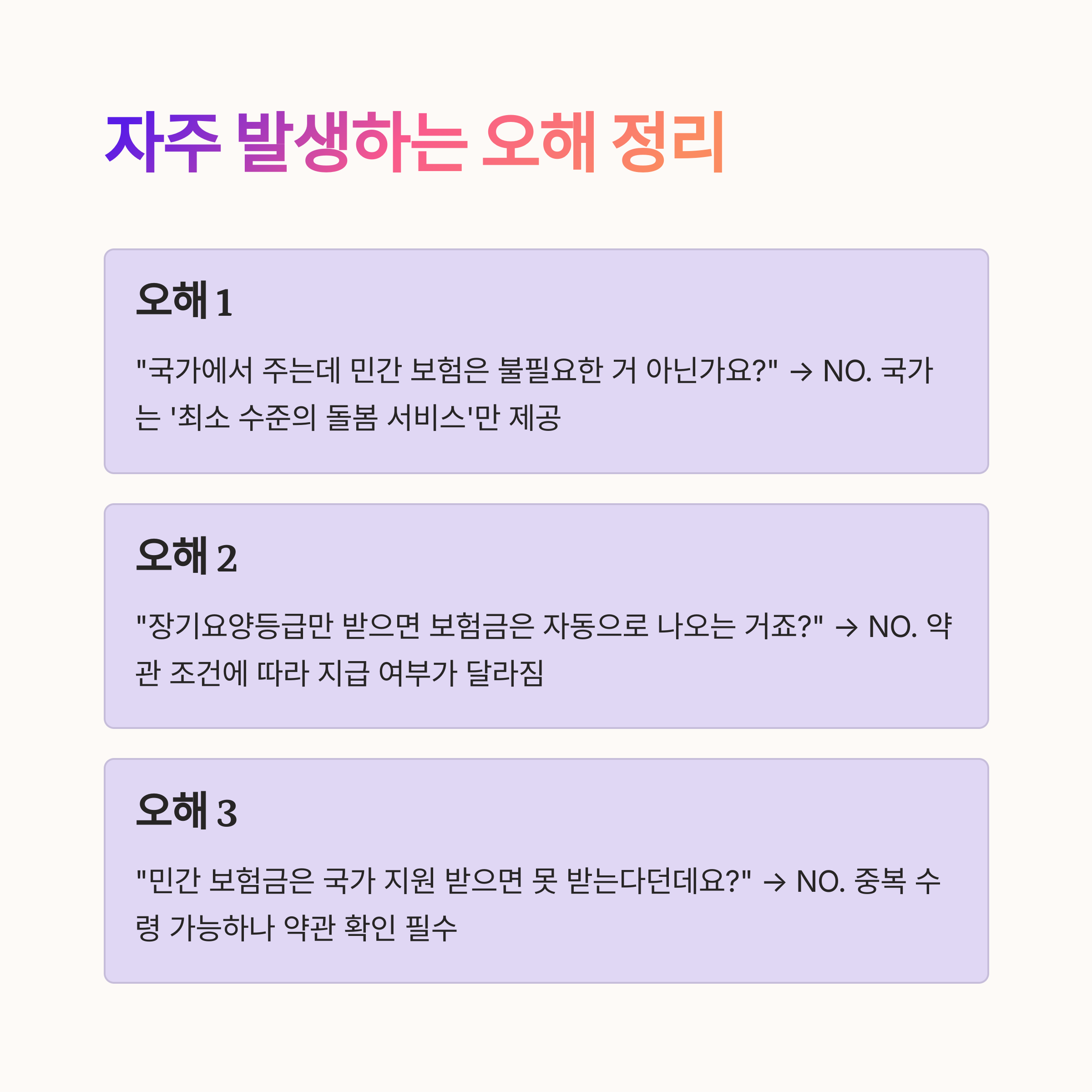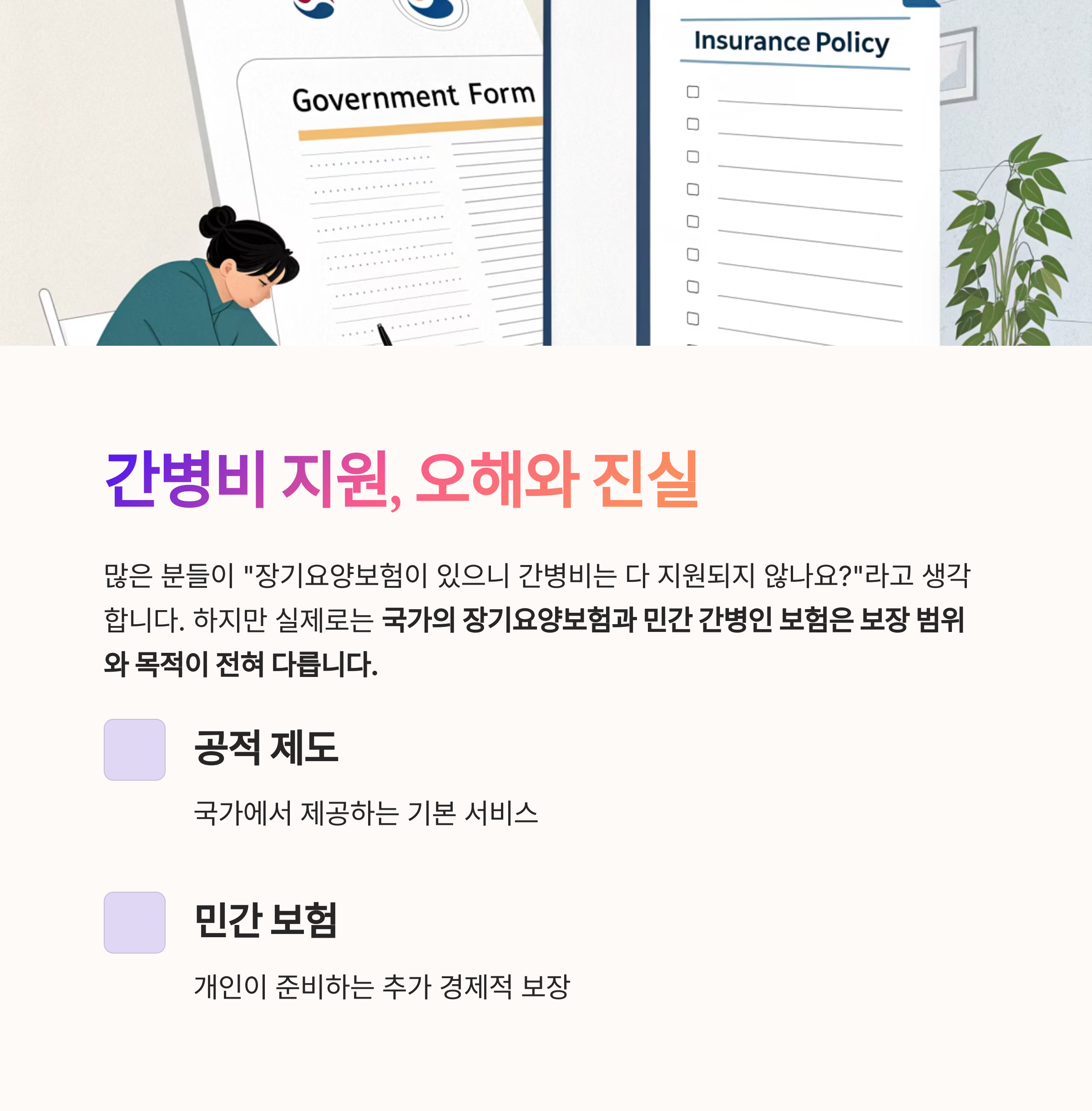 하지만 실제로는 국가의 장기요양보험과 민간 간병인 보험은 보장 범위와 목적이 전혀 다릅니다.