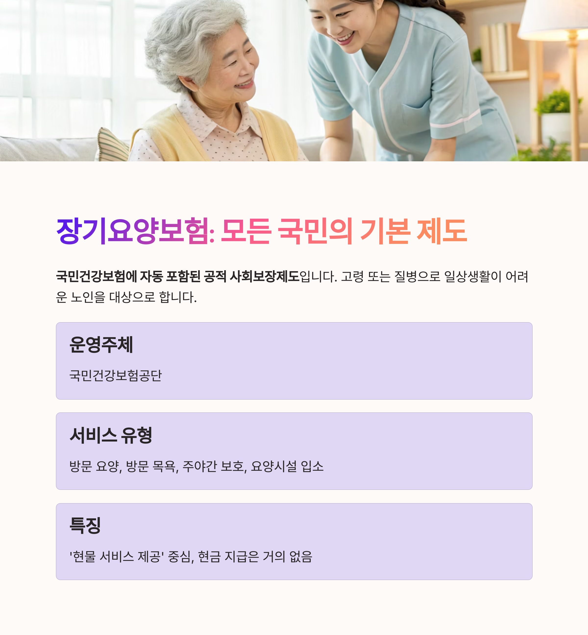 | 서비스 내용 | 방문요양, 시설이용 등 | 간병비 보장, 진단 보장금 등 |