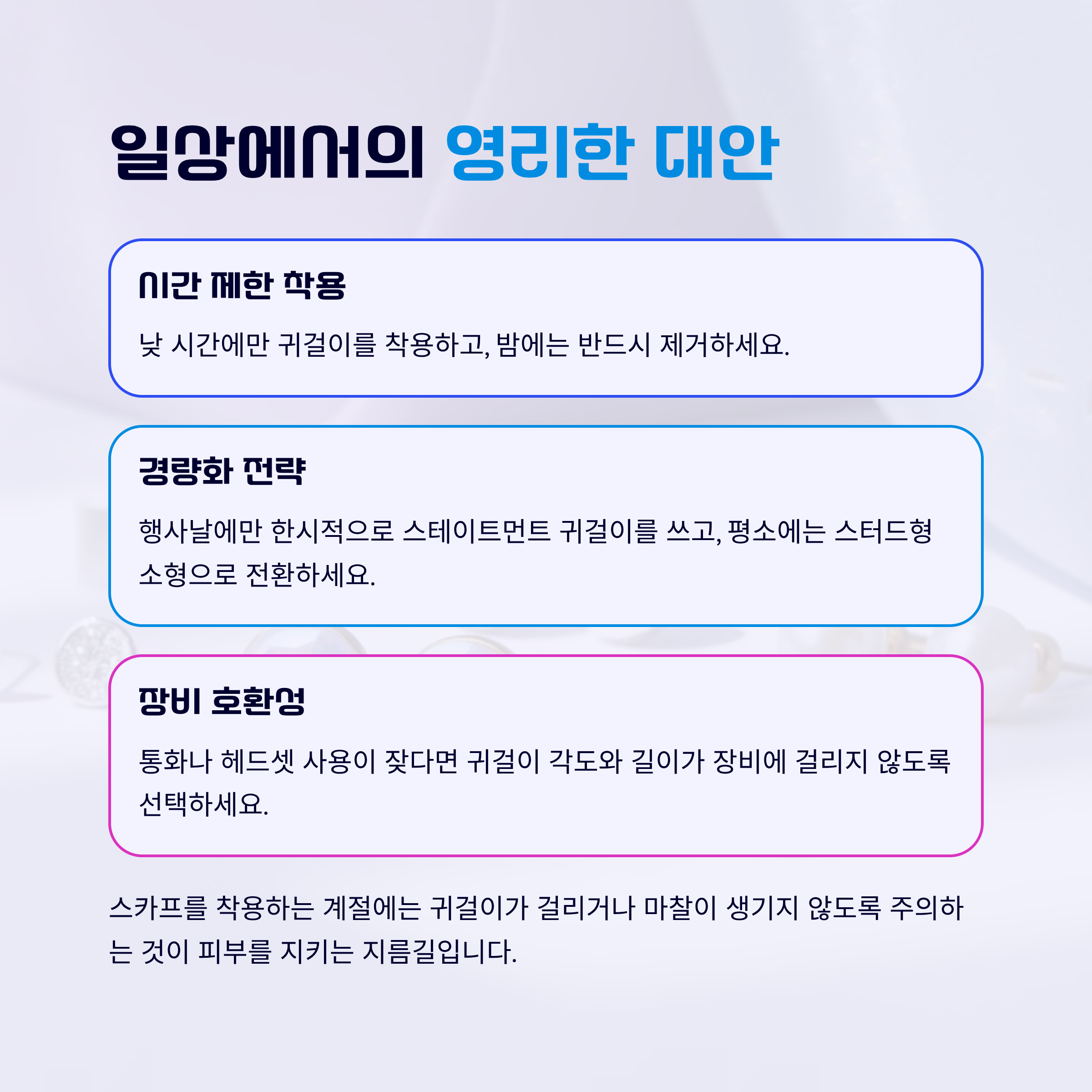 귀걸이 각도와 길이가 장비에 걸리지 않도록 선택하세요. 스카프를