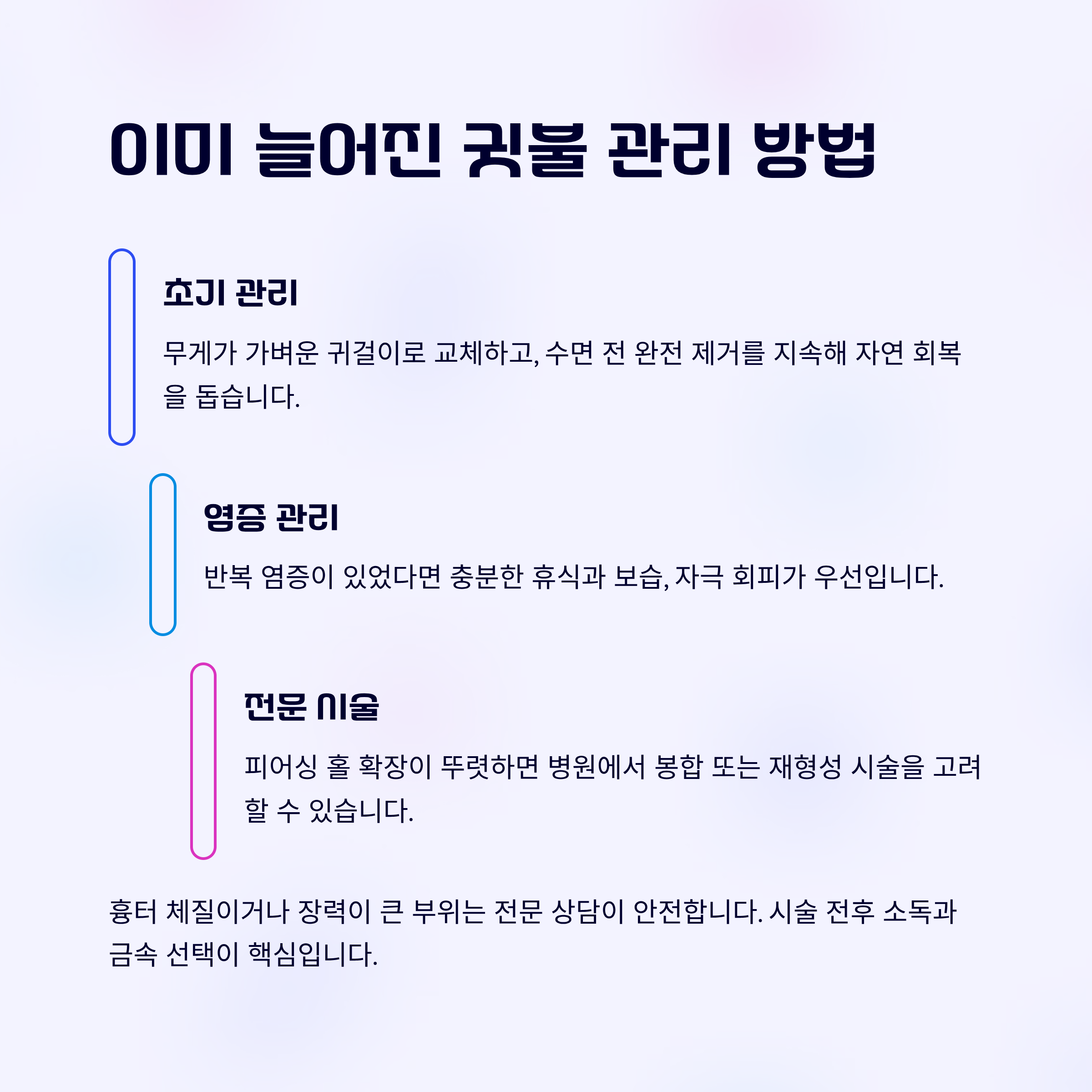 보습, 자극 회피가 우선입니다. 피어싱 홀 확장이 뚜렷하면 병원에서