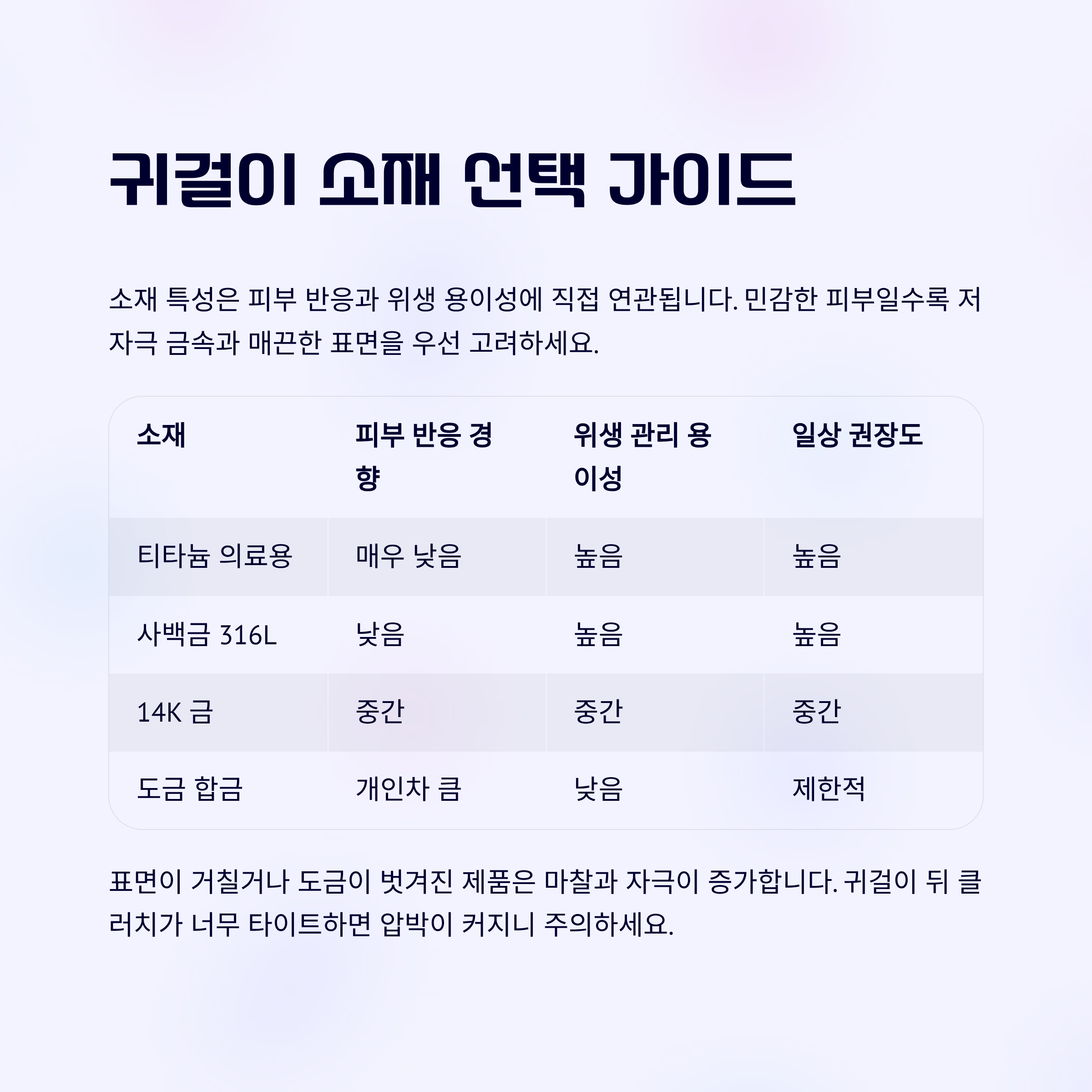 민감 피부일수록 저자극 금속과 매끈한 표면을 우선 고려하세요.