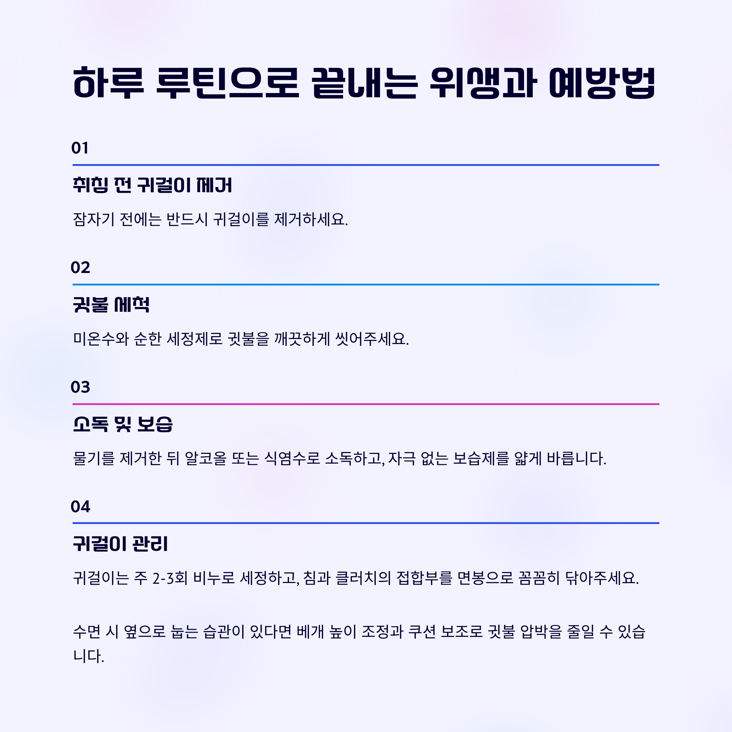 여러 항목이 겹치면 수면 전 제거와 위생 관리가 특히 중요합니다.