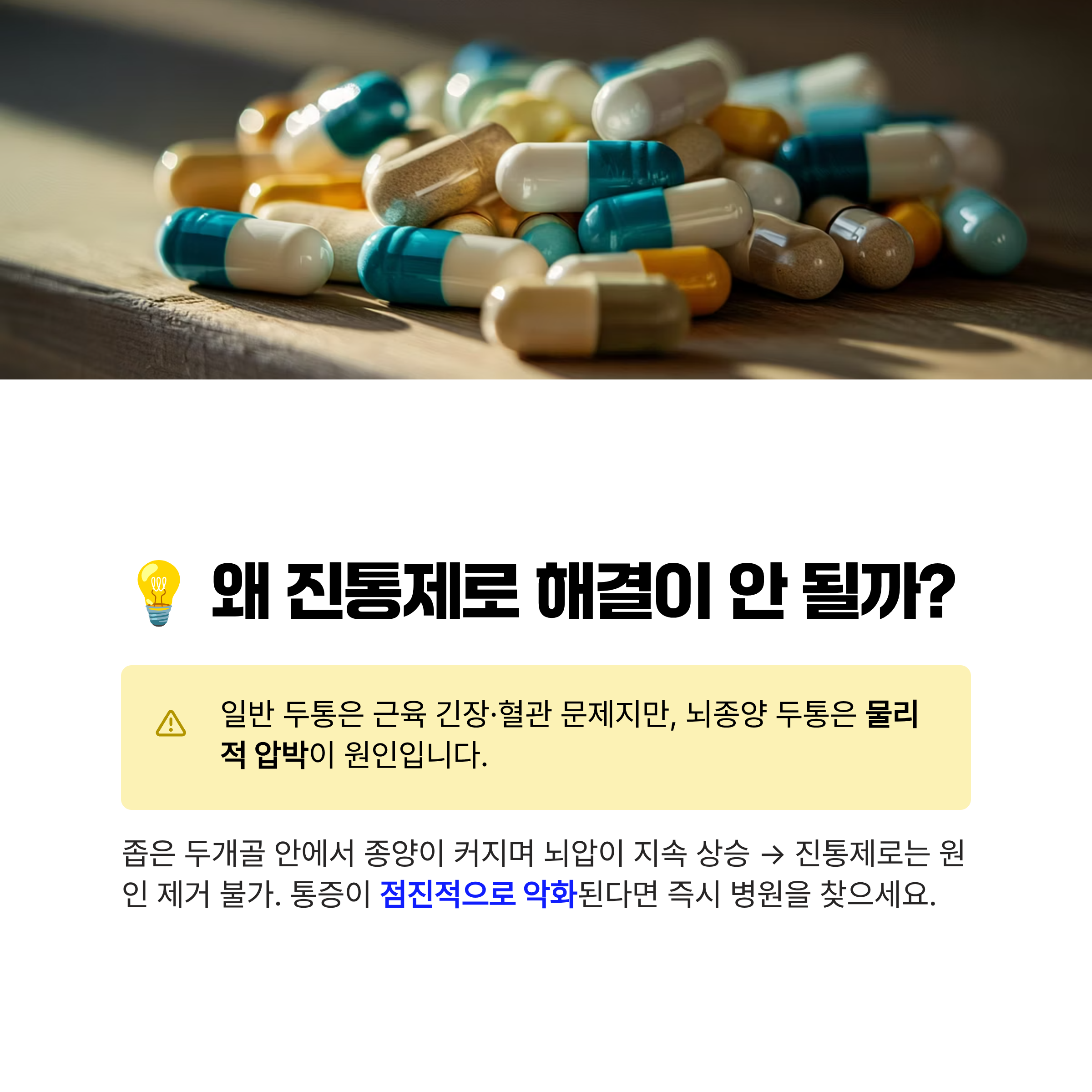 긴장성 두통이나 편두통은 근육의 긴장이나 혈관의 일시적인 문제지만, 뇌종양 두통은 '물리적인 압박' 때문입니다. 좁은 두개골 안에서 종양이 커지며 뇌압이 지속적으로 상승하기 때문에 일반적인 진통제로는 통증의 원인을 제거할 수 없습니다. 따라서 약을 먹어도 낫지 않고 통증이 **'점진적으로 악화'**된다면 지체 없이 병원을 찾아야 합니다.