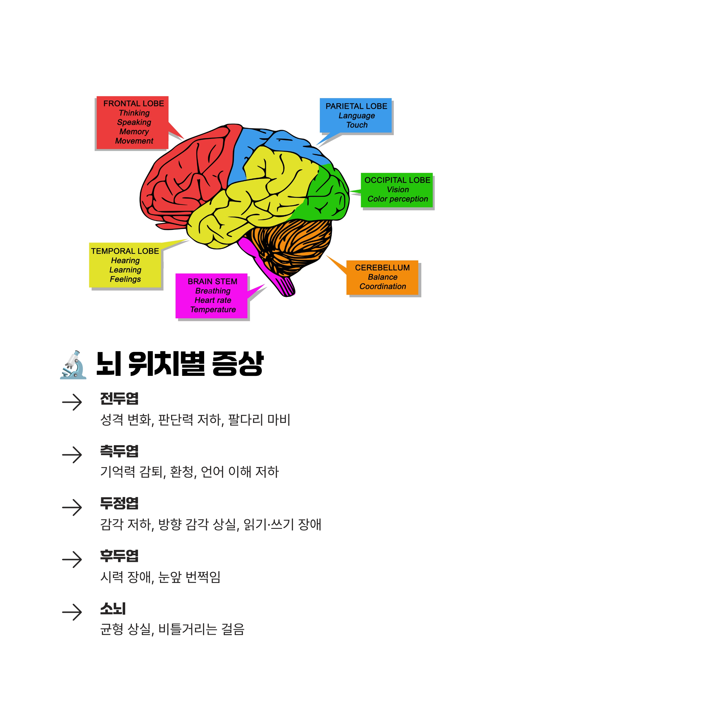 - 전두엽: 성격 변화, 판단력 저하, 한쪽 팔다리 마비
