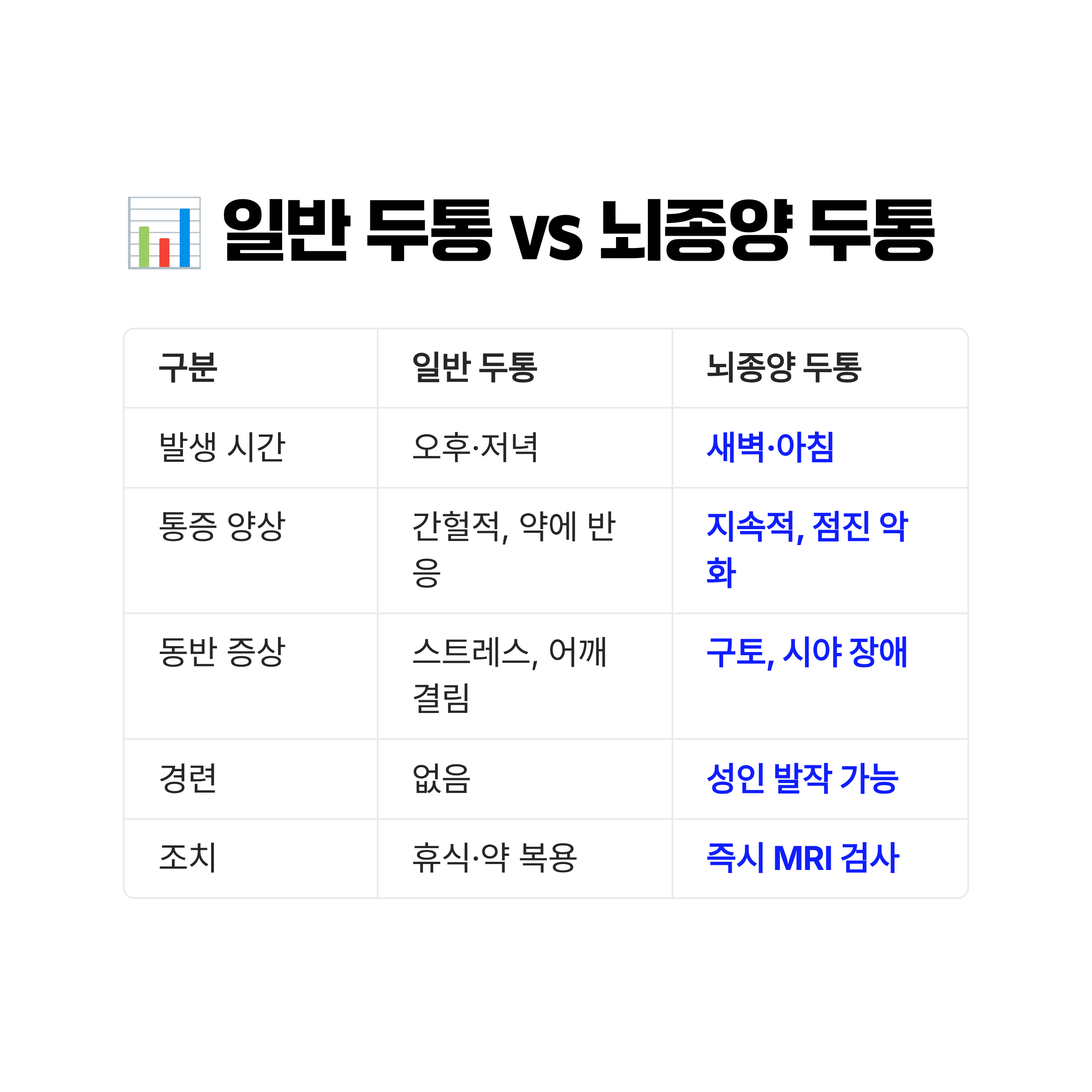 | 동반 증상 | 스트레스, 어깨 결림 | 구토, 시야 장애, 성격 변화 |