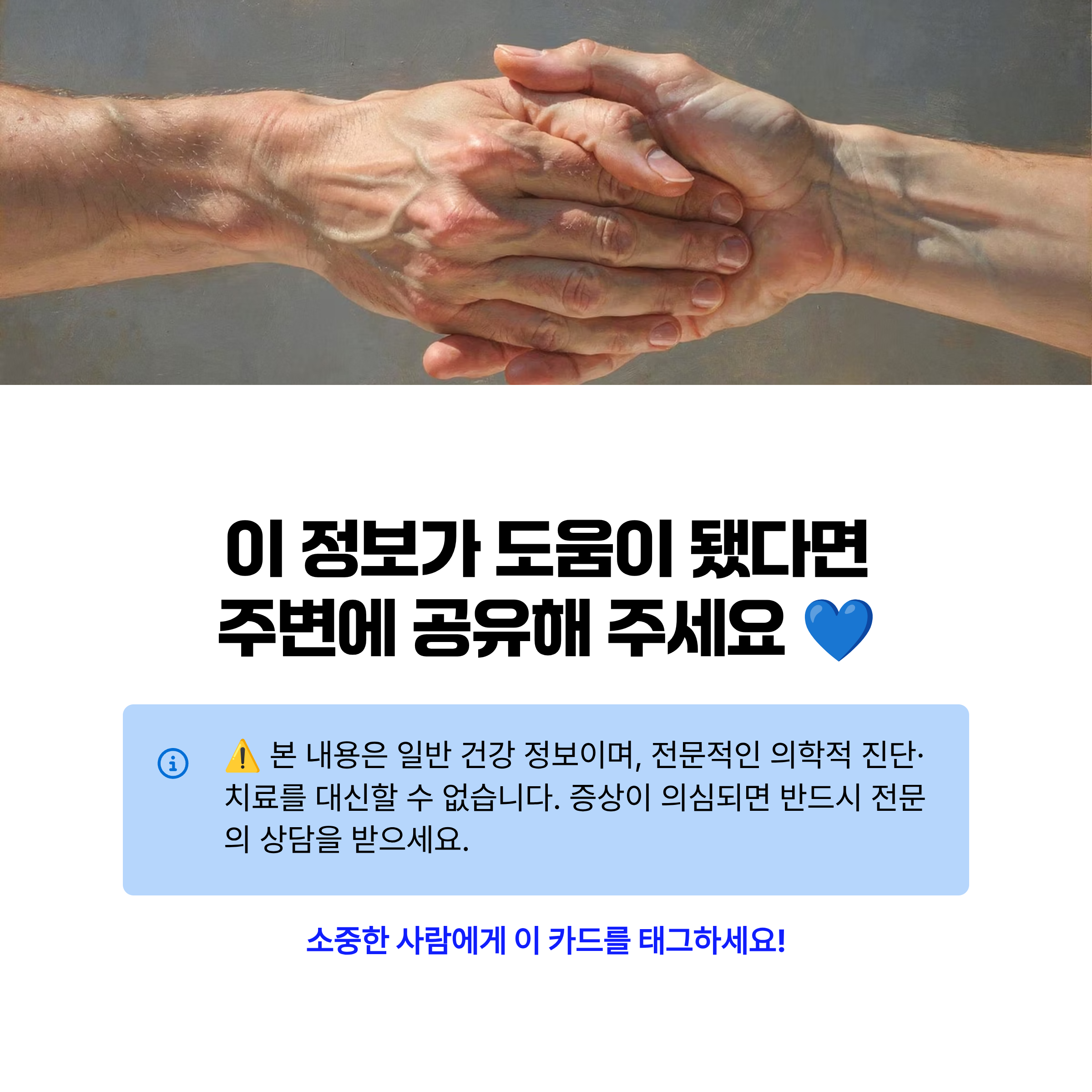 ⚠️ 면책사항 본 포스팅은 일반적인 건강 정보를 제공하며, 전문적인 의학적 진단이나 치료를 대신할 수 없습니다. 증상이 의심될 경우 반드시 의료기관을 방문하여 전문의의 상담을 받으시길 바랍니다.