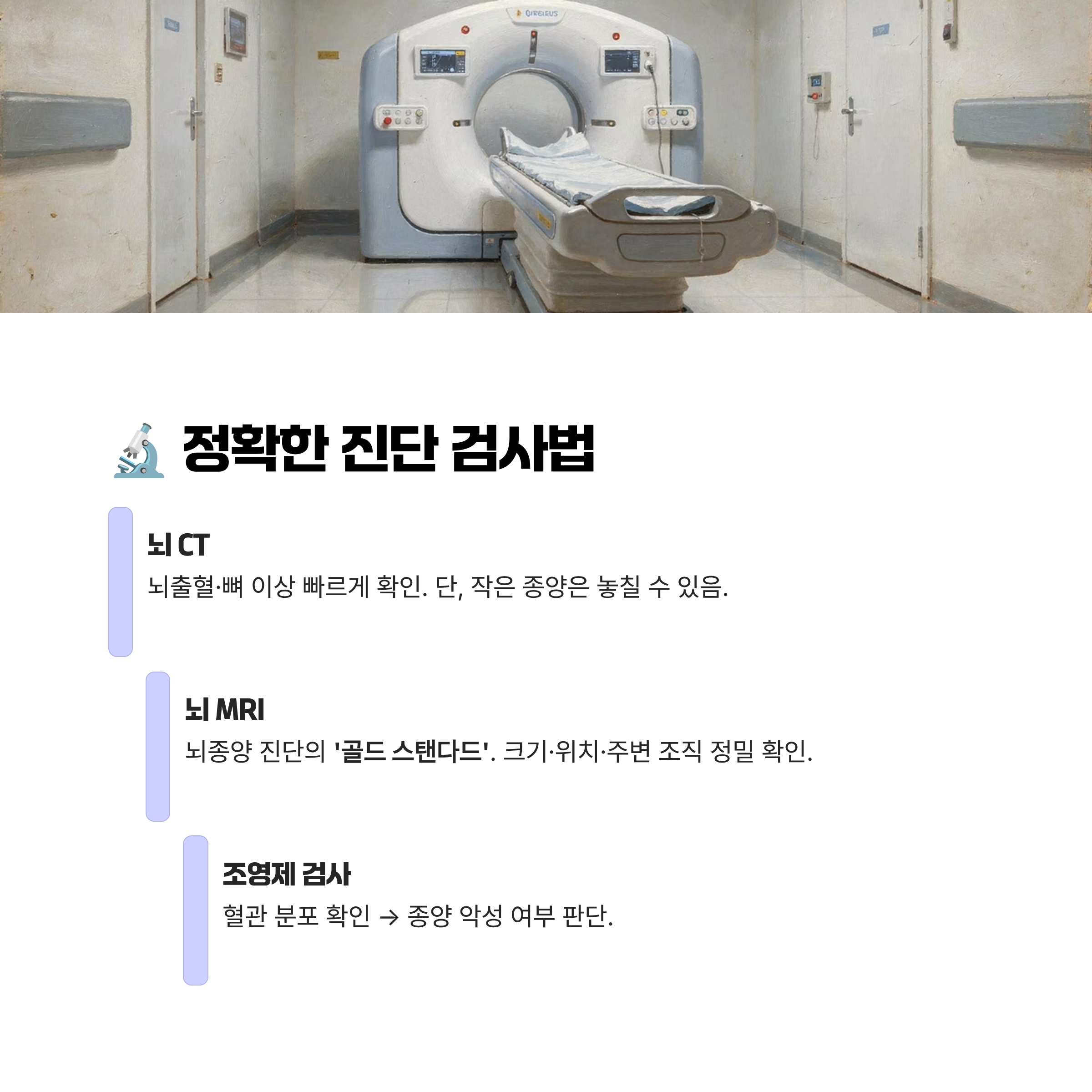 - 뇌 MRI: 뇌종양 진단의 '골드 스탠다드'입니다. 종양의 크기, 위치, 주변 조직과의 관계를 가장 정밀하게 보여줍니다.
