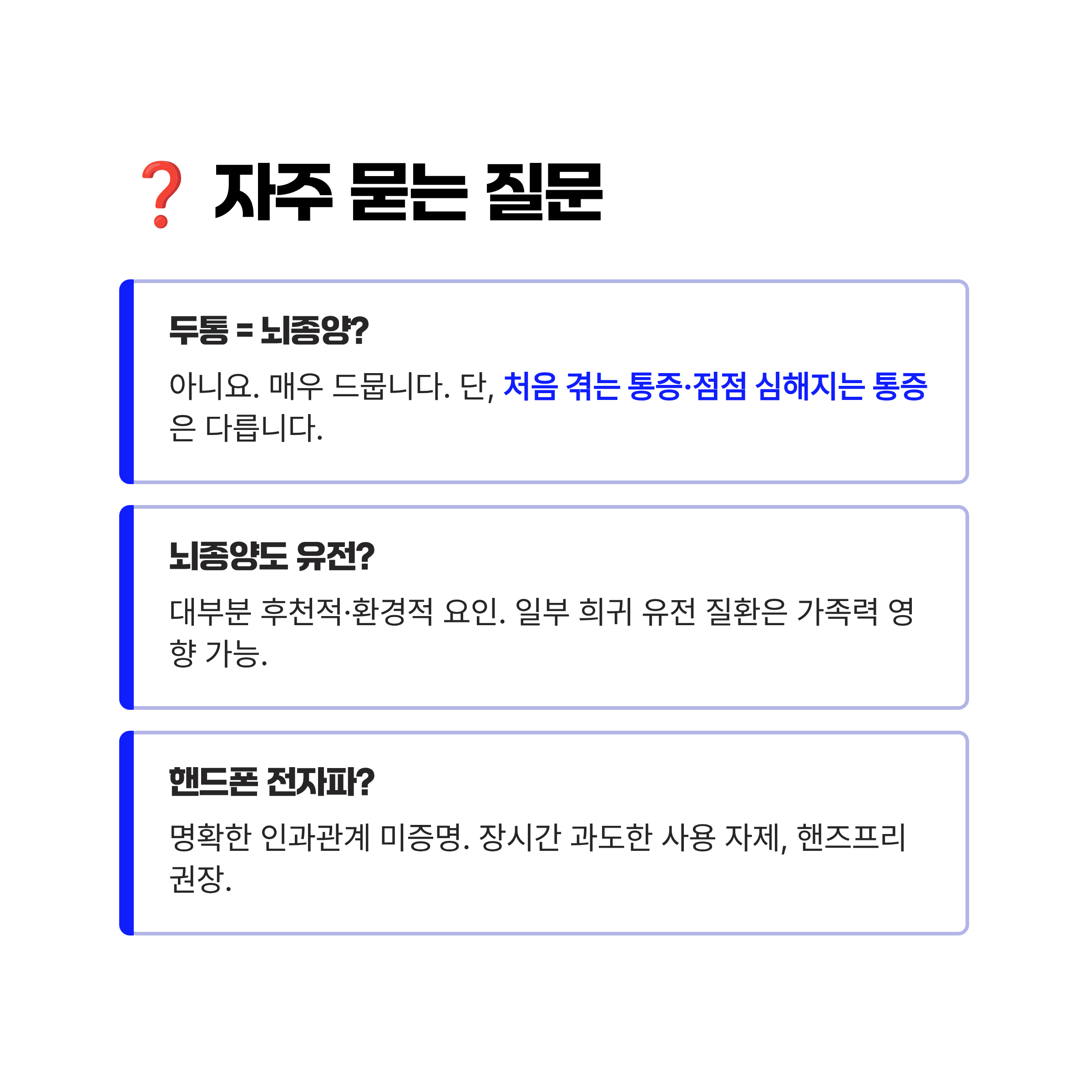 아니요. 전체 두통 환자 중 뇌종양인 경우는 매우 드뭅니다. 하지만 '생전 처음 겪는 통증', **'점점 심해지는 통증'**이라면 이야기가 다릅니다.