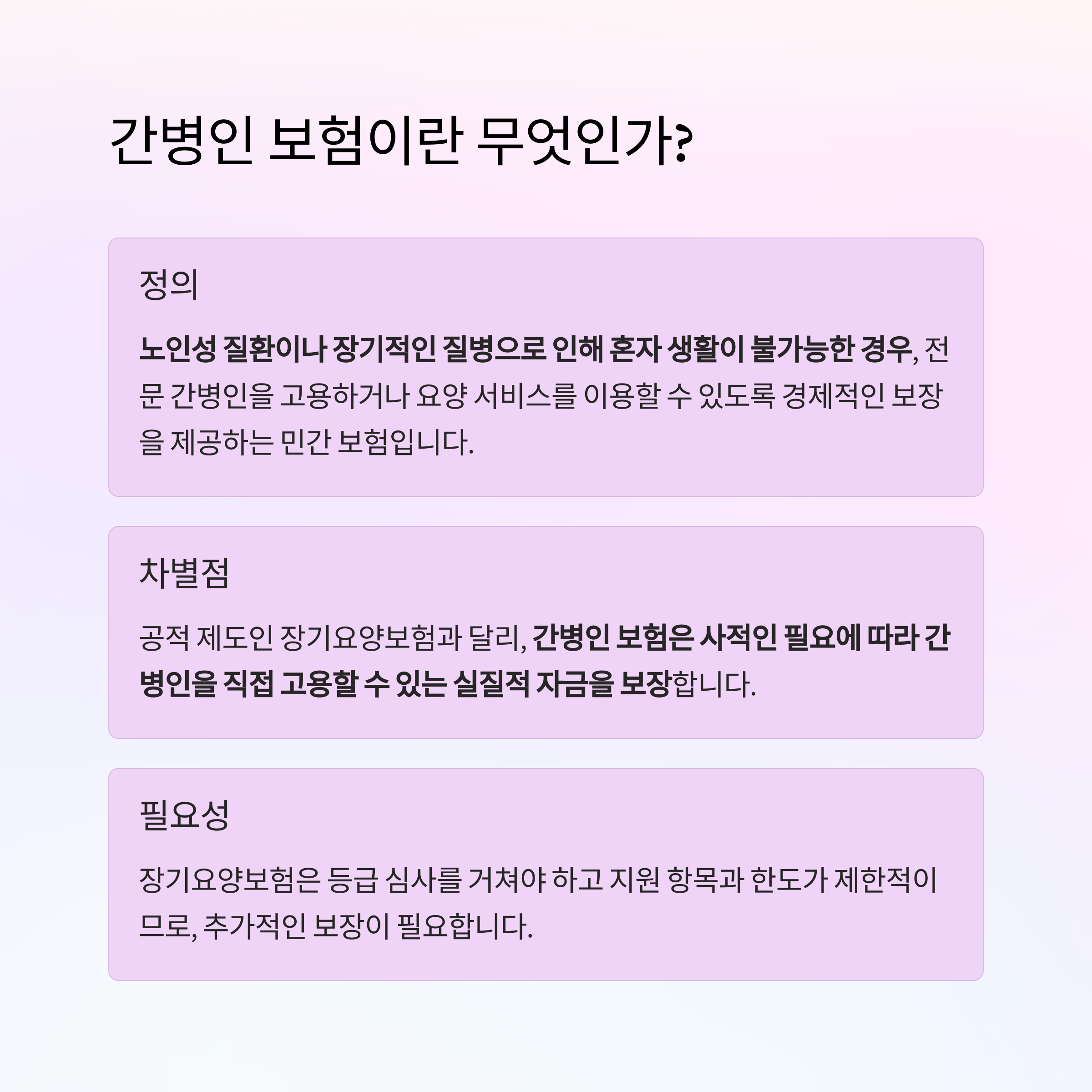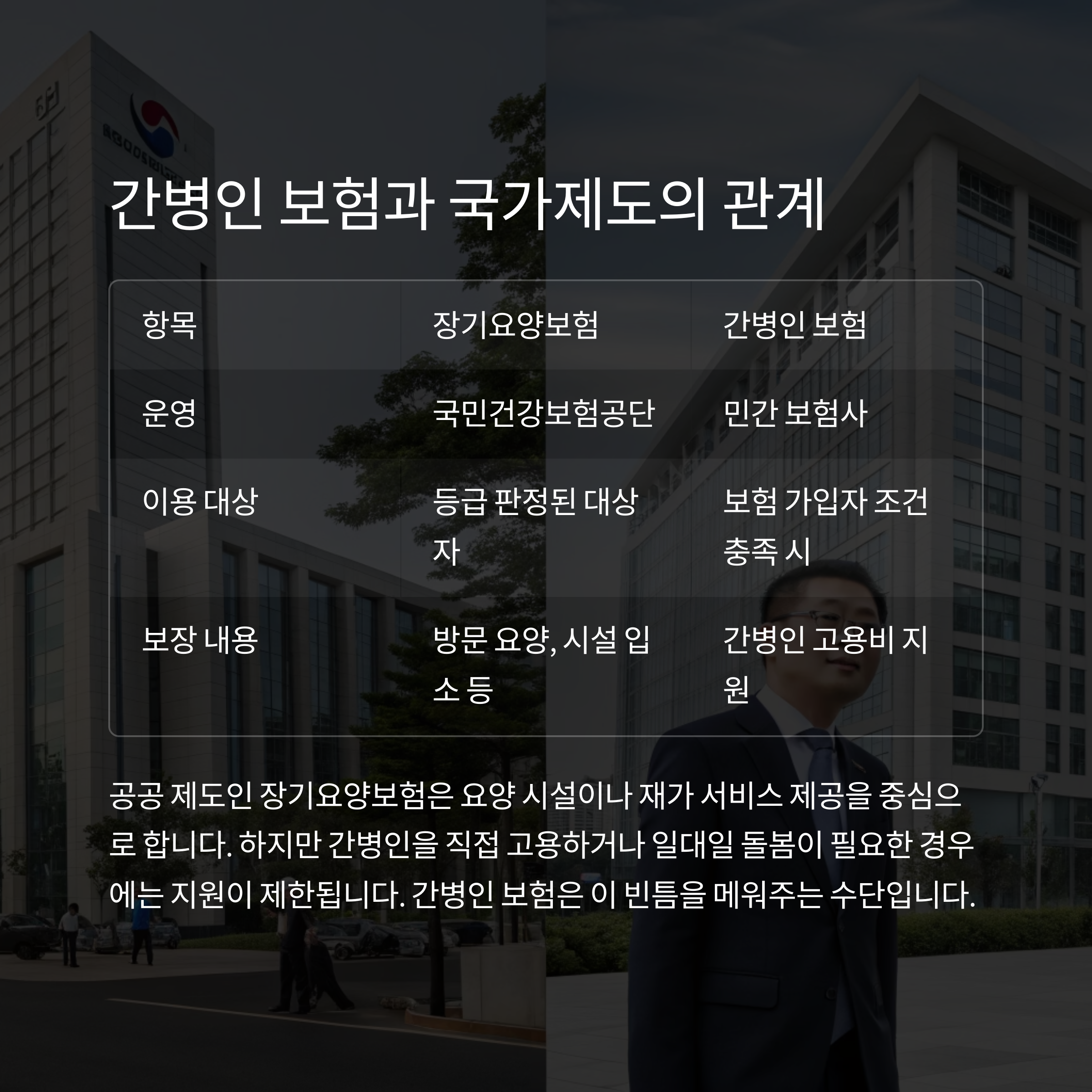 반면, 간병인 보험은 사적인 필요에 따라 간병인을 직접 고용할 수 있는 실질적 자금을 보장한다는 점에서 차별화됩니다.