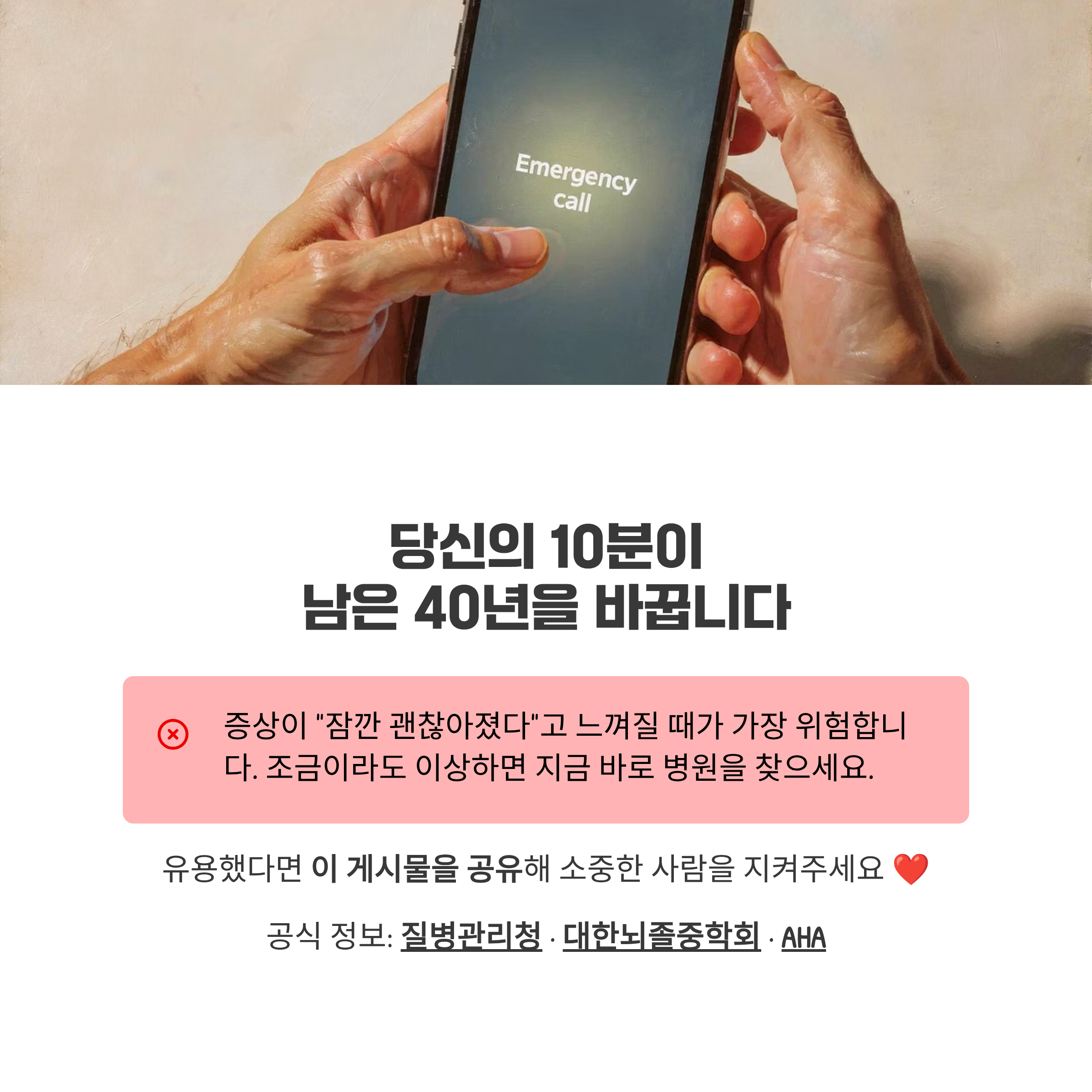 결론: 뇌경색은 "잠깐 괜찮아졌다"고 느껴질 때가 가장 위험한 시기입니다. 당신의 10분 결정이 남은 40년의 인생을 좌우합니다. 조금이라도 이상하다면 망설이지 말고 지금 바로 병원을 찾으세요.