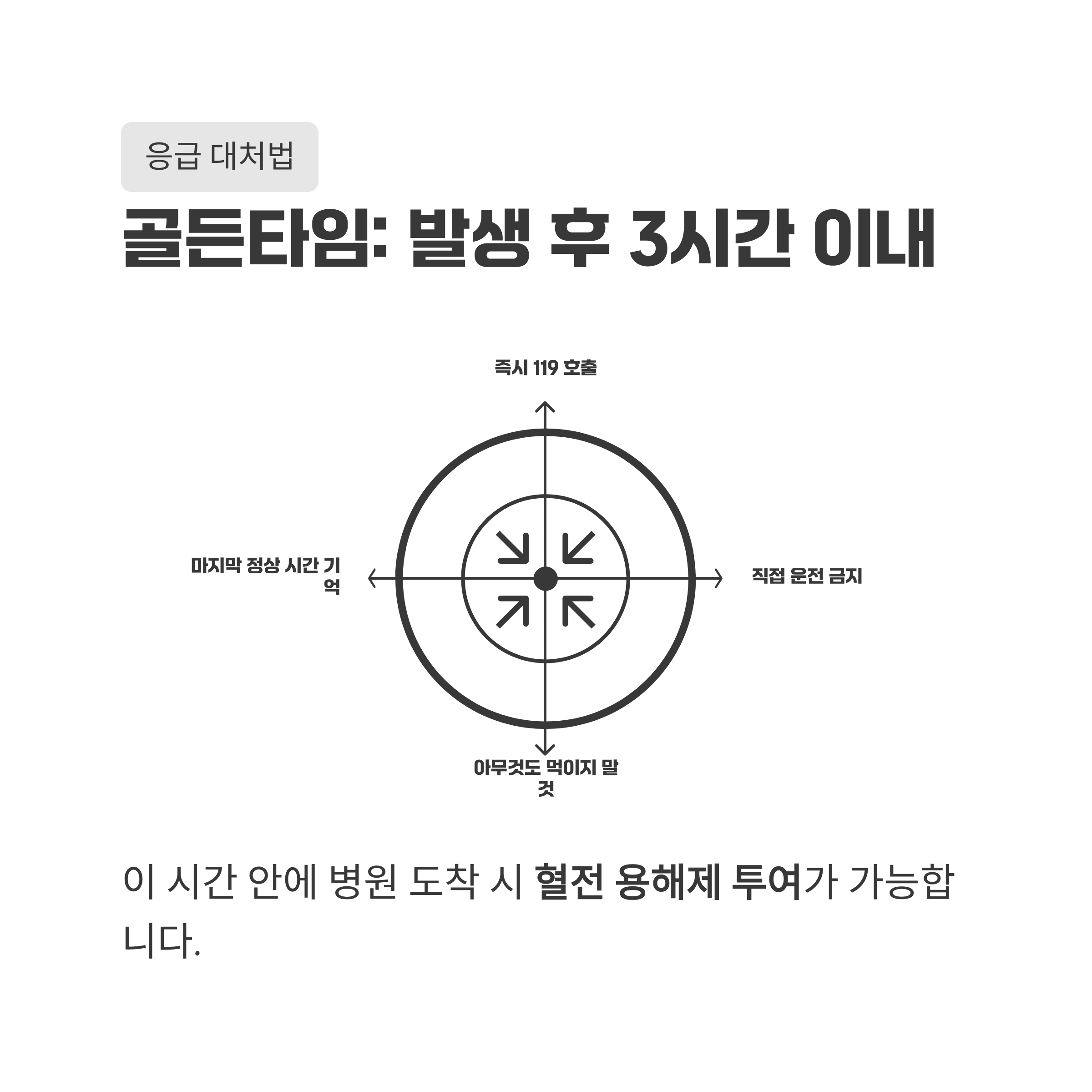 뇌졸중 치료의 골든타임은 발생 후 3시간(최대 4.5시간) 이내입니다. 이 시간 안에 병원에 도착해야 혈전 용해제 투여가 가능합니다.