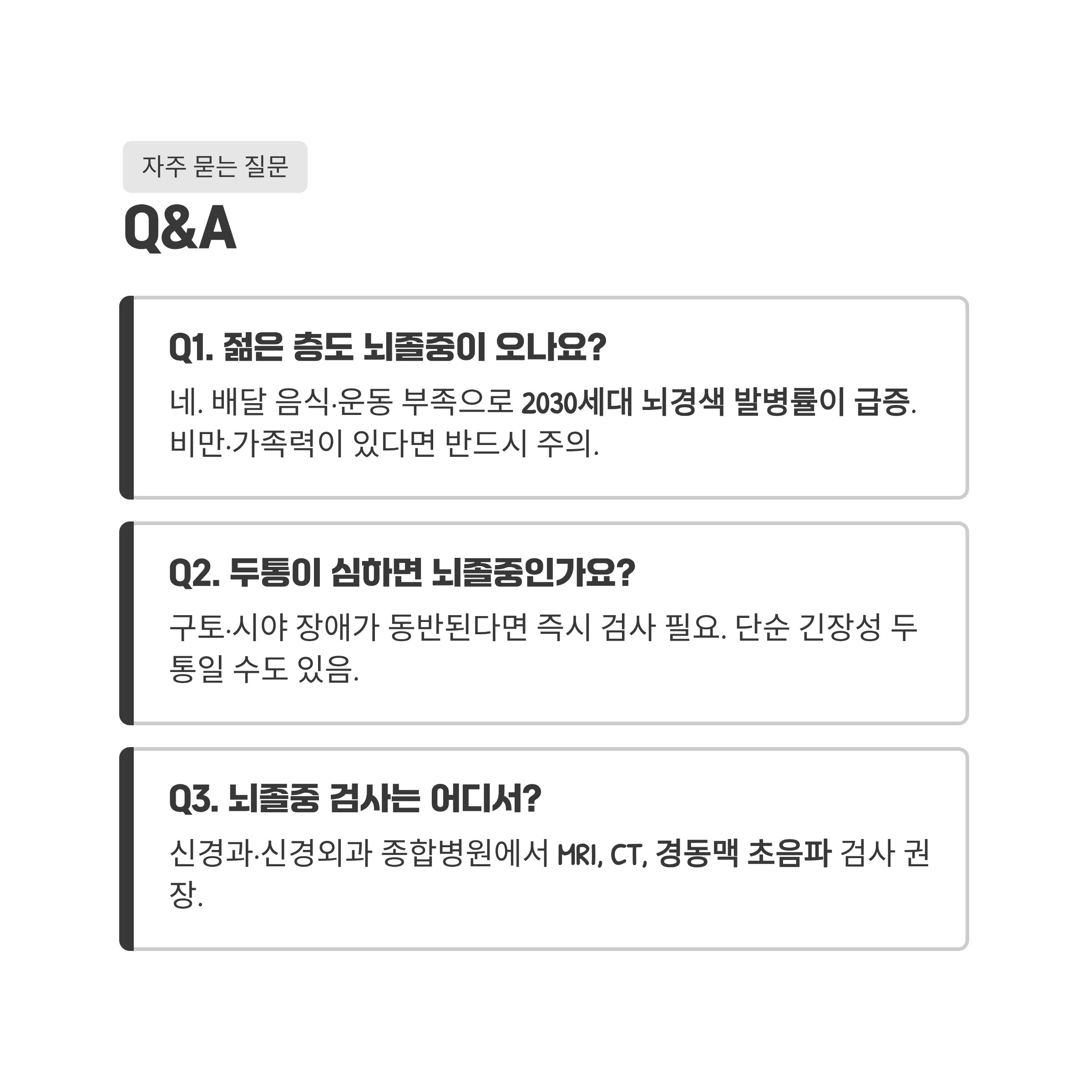 A: 네, 최근 자극적인 배달 음식과 운동 부족으로 2030 세대의 뇌경색 발병률이 급증하고 있습니다. 비만이나 가족력이 있다면 반드시 주의해야 합니다.