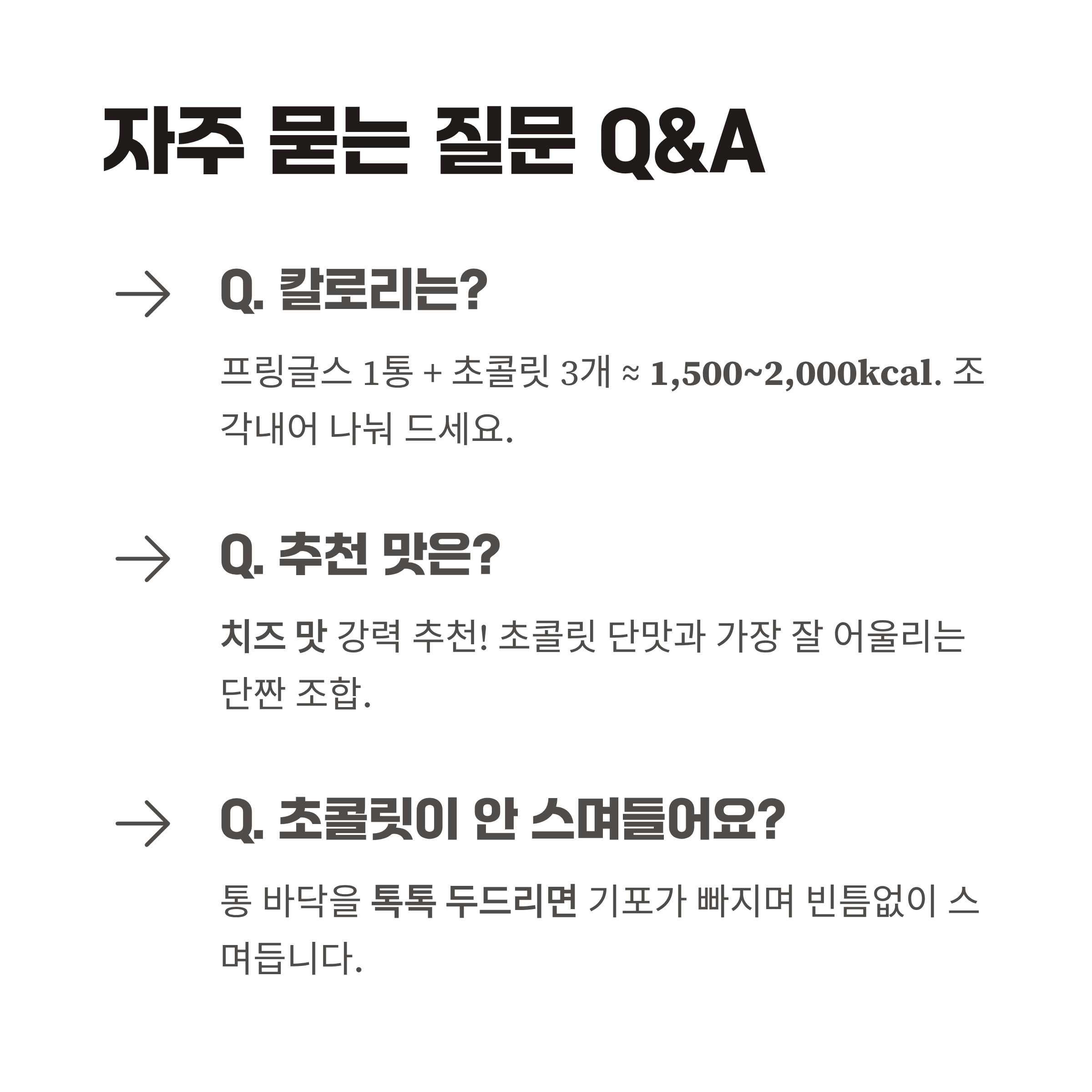 A2. 가장 추천하는 것은 '치즈 맛'입니다. 초콜릿의 단맛과 가장 잘 어울리는 강력한 짭조름한 풍미(단짠)를 느낄 수 있습니다.