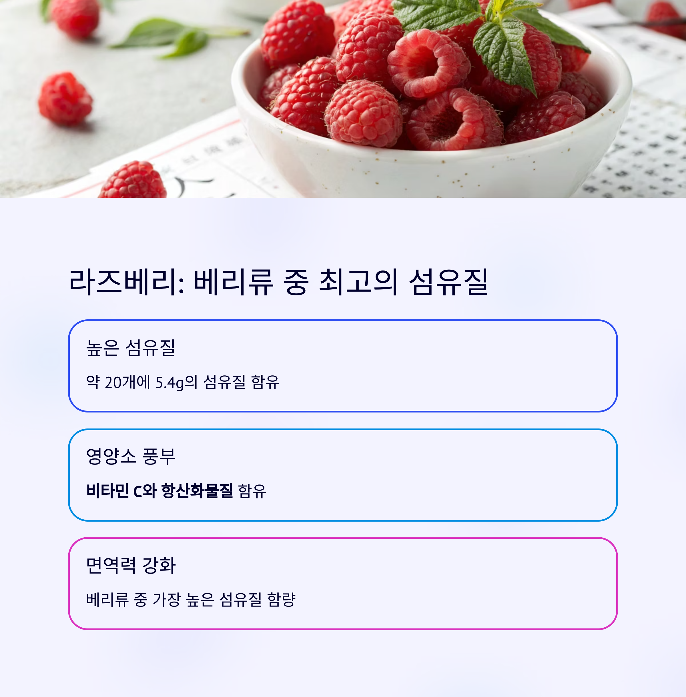 | 라즈베리 | 5.4g (20개) | 베리류 중 최고 섬유질 |