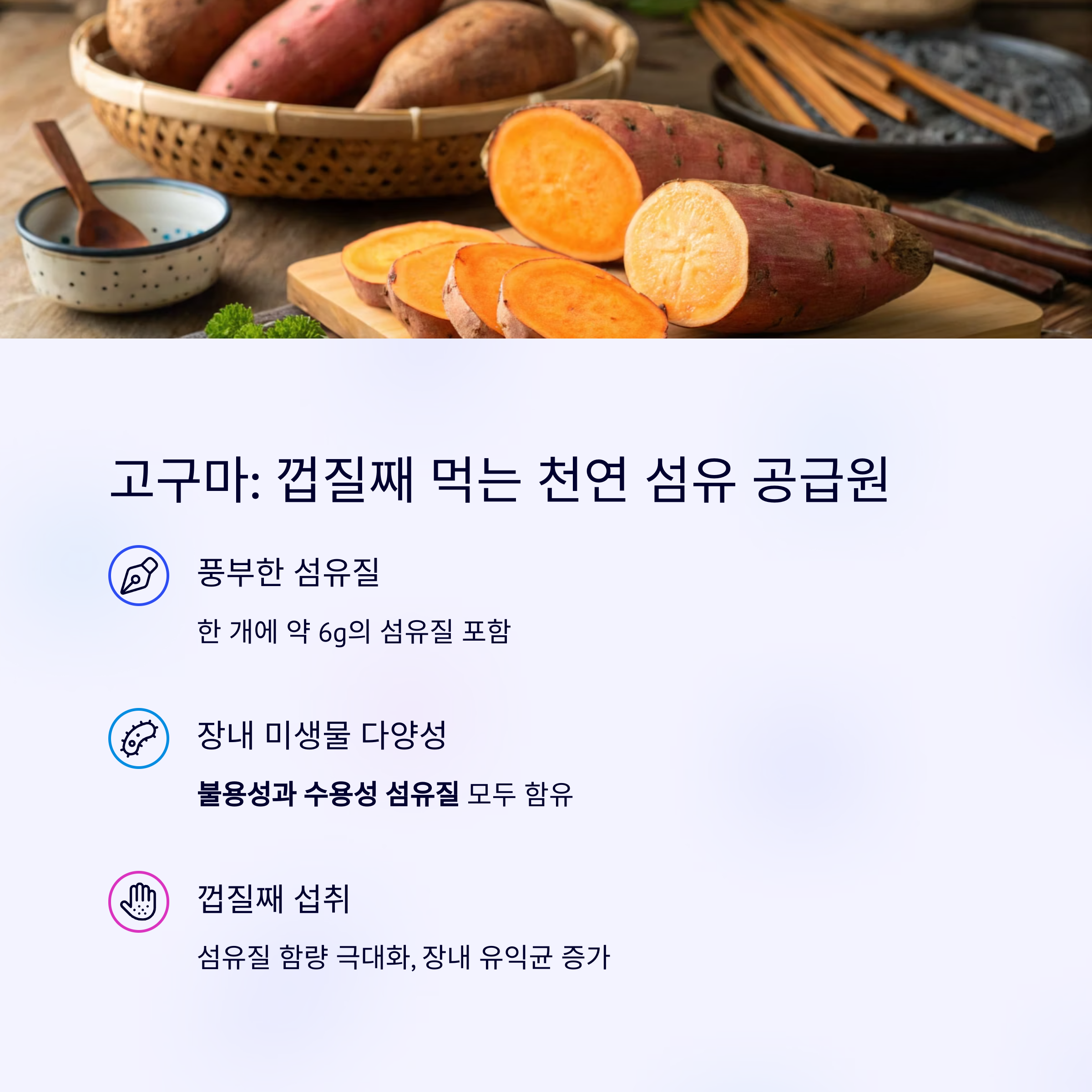 | 고구마 | 6g (1개) | 장내 미생물 다양성 촉진 |