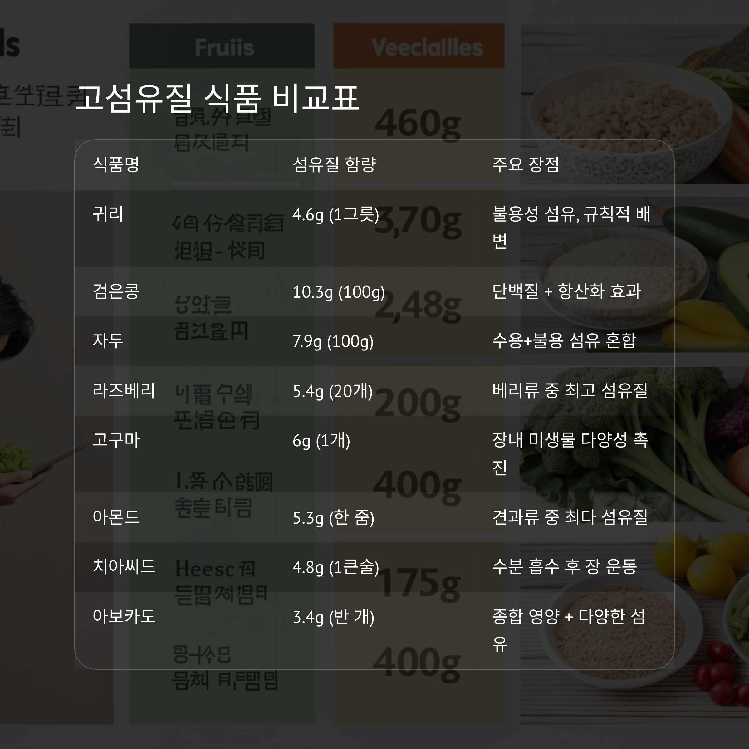 식품명 섬유질 함량 (기준량) 주요 장점