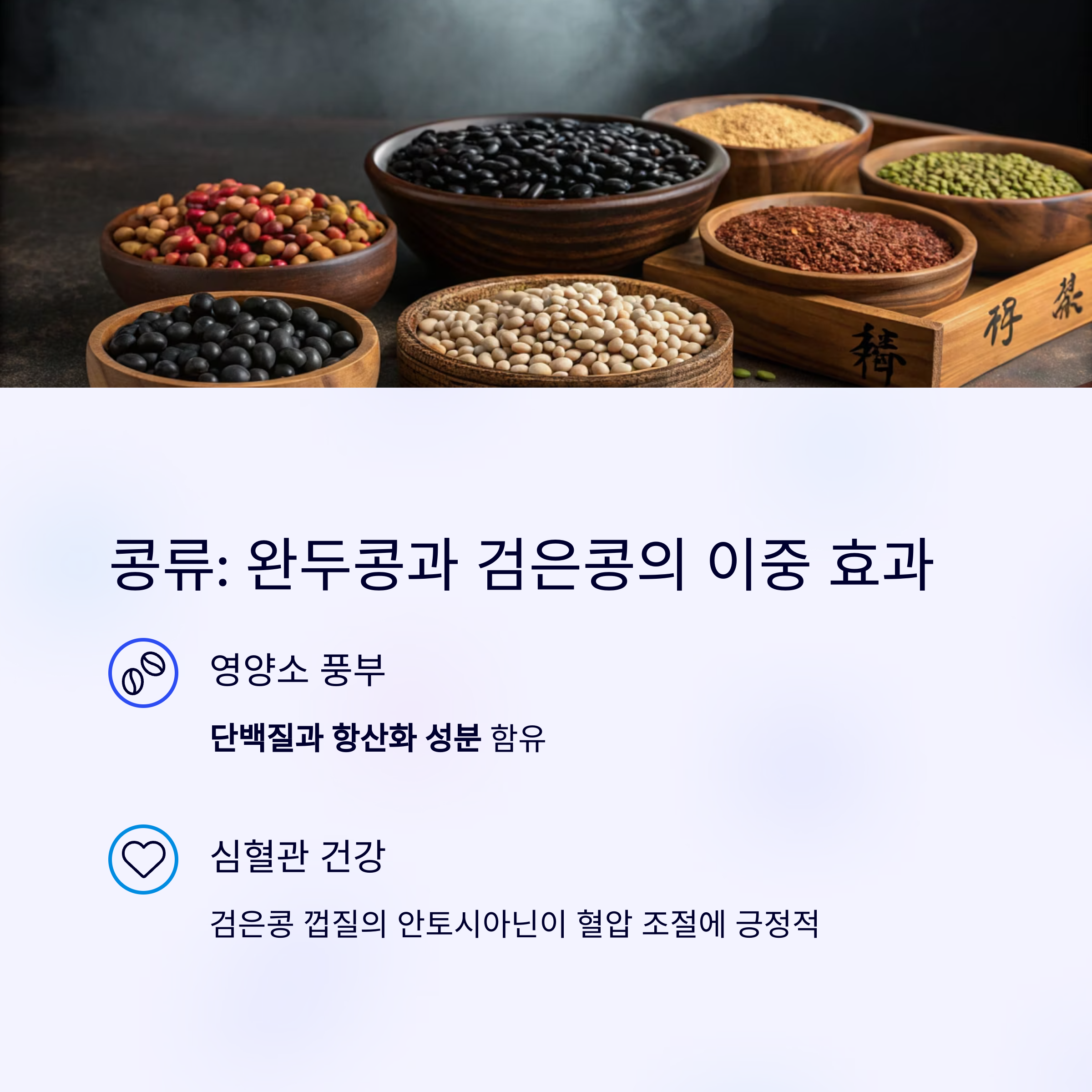 | 콩류 (검은콩) | 10.3g (100g) | 단백질 + 항산화 효과 |