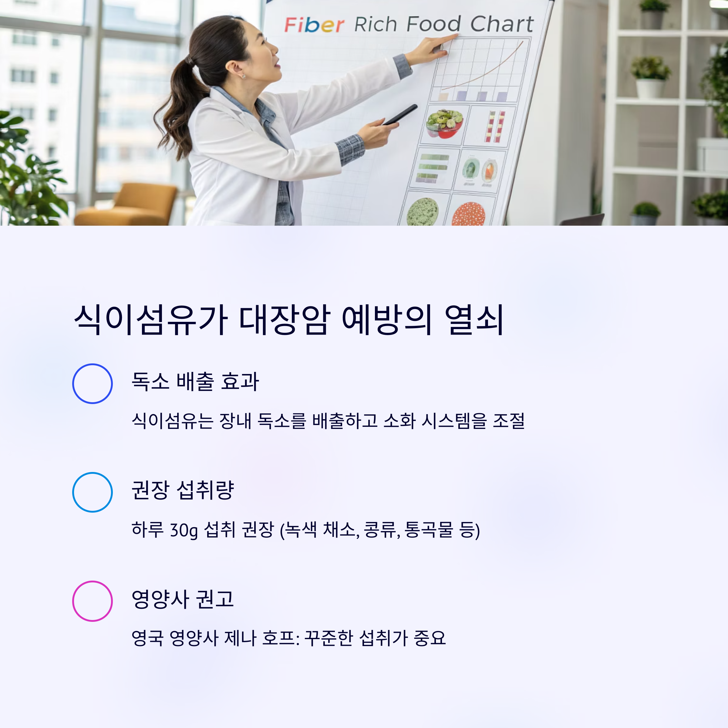 식이섬유의 꾸준한 섭취가 대장암 예방에 중요하다고 강조했습니다.