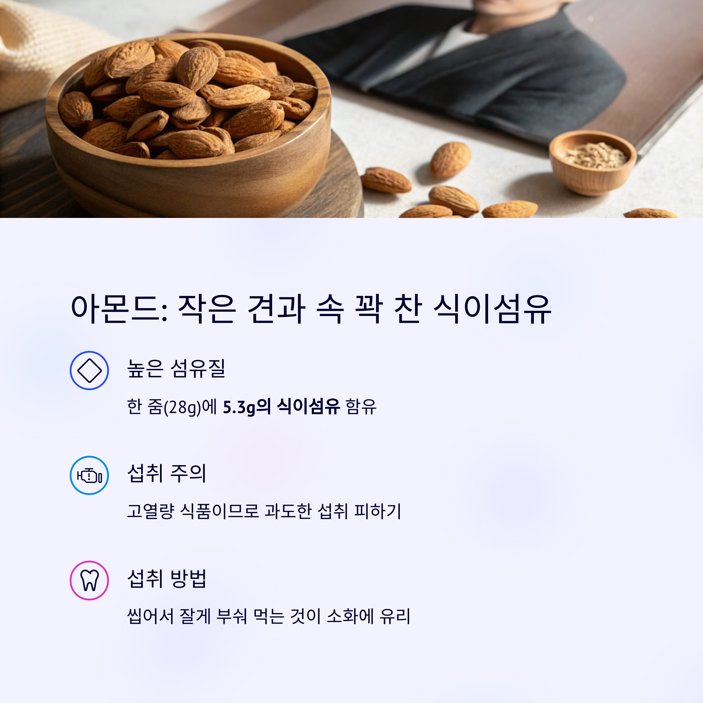 | 아몬드 | 5.3g (한 줌) | 견과류 중 최다 섬유질 |