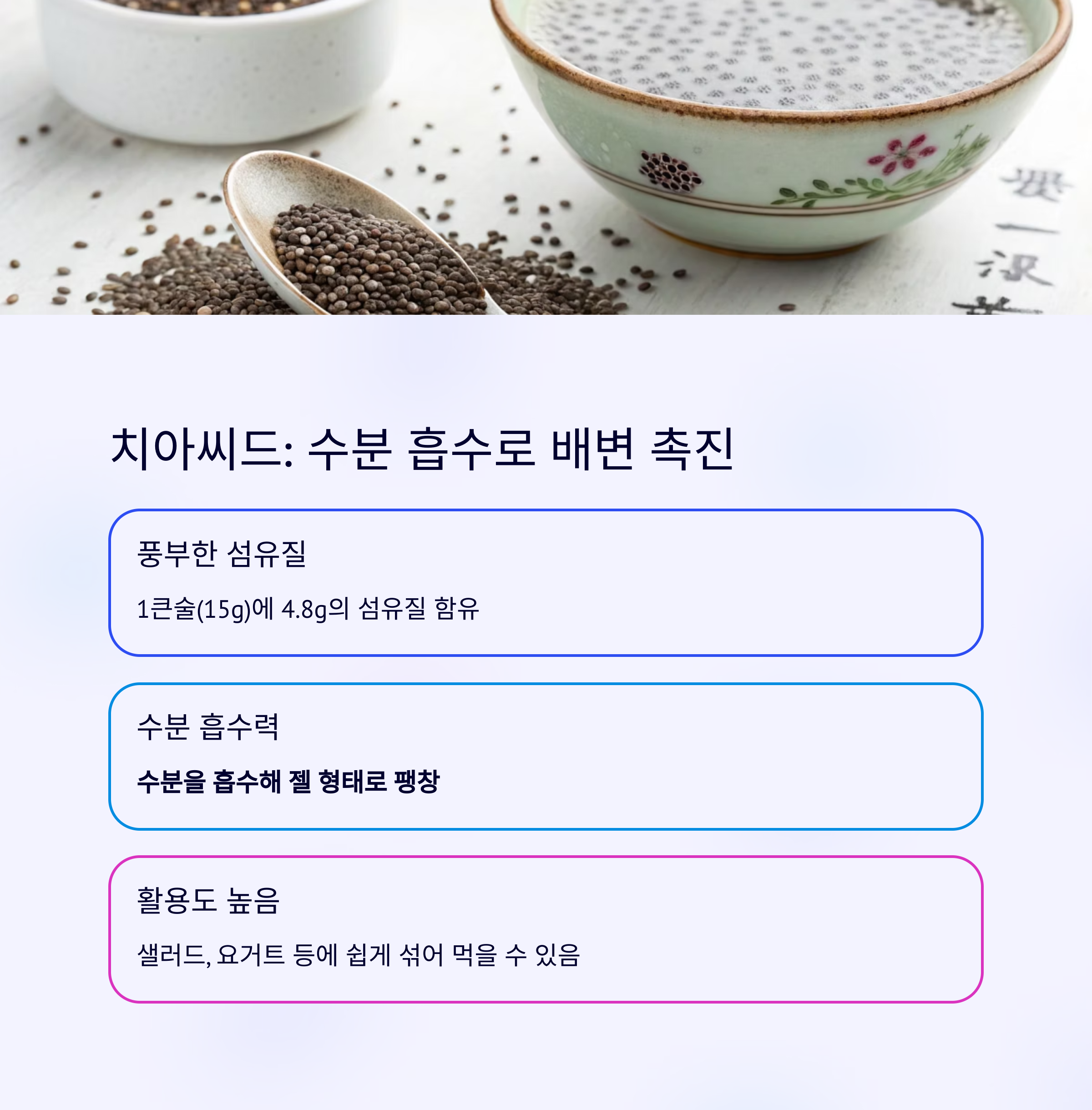 | 치아씨드 | 4.8g (1큰술) | 수분 흡수 후 장 운동 |