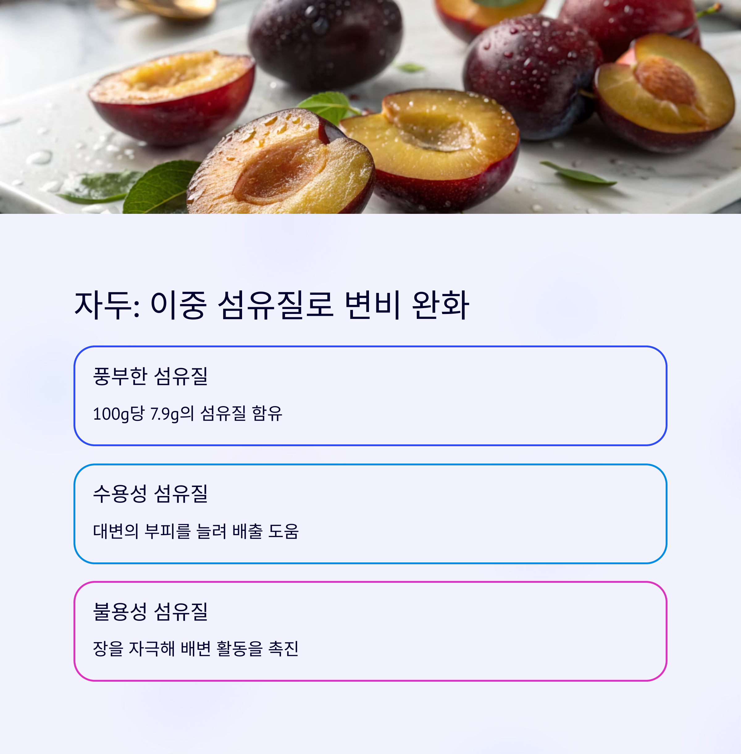 | 자두 | 7.9g (100g) | 수용+불용 섬유 혼합 |