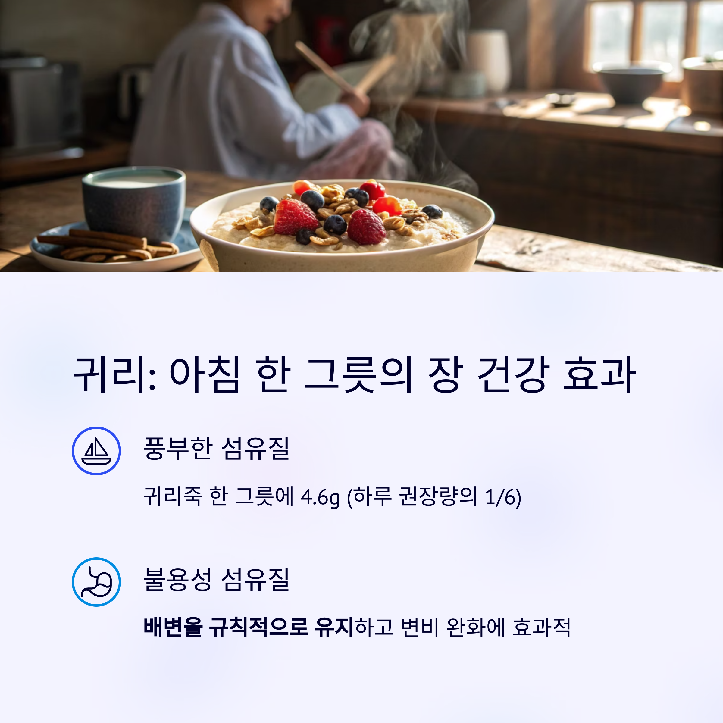 | 귀리 | 4.6g (귀리죽 1그릇) | 불용성 섬유, 규칙적 배변 |