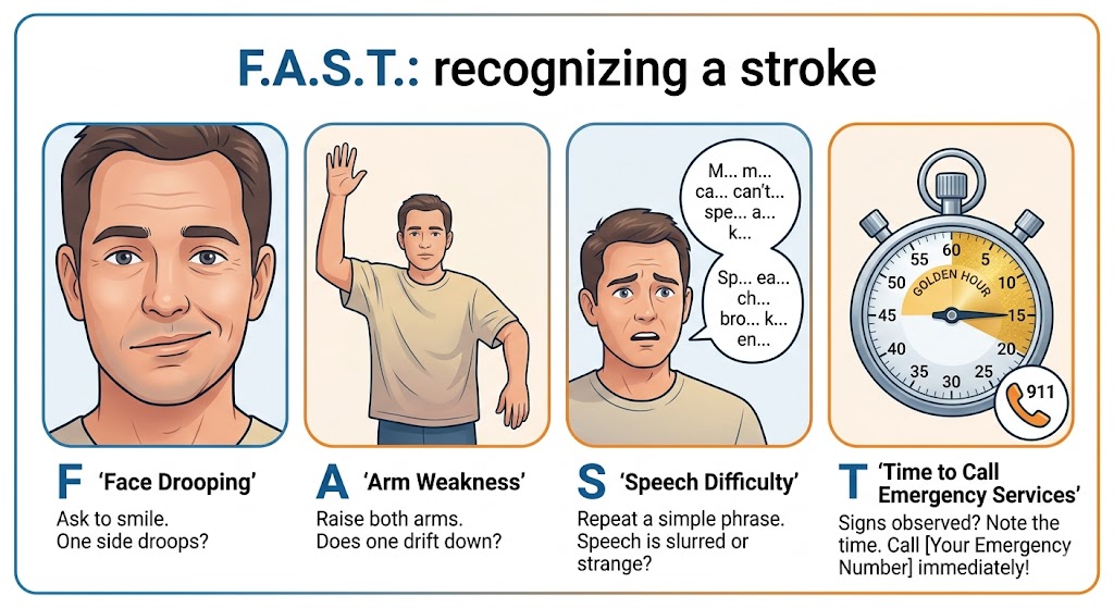 말이 어눌해질 때 이것이 뇌졸중인지 아닌지 빠르게 판단하는 것이 생명을 살리는 길입니다. 전 세계적으로 통용되는 'FAST' 법칙을 꼭 머릿속에 저장해 두세요.
