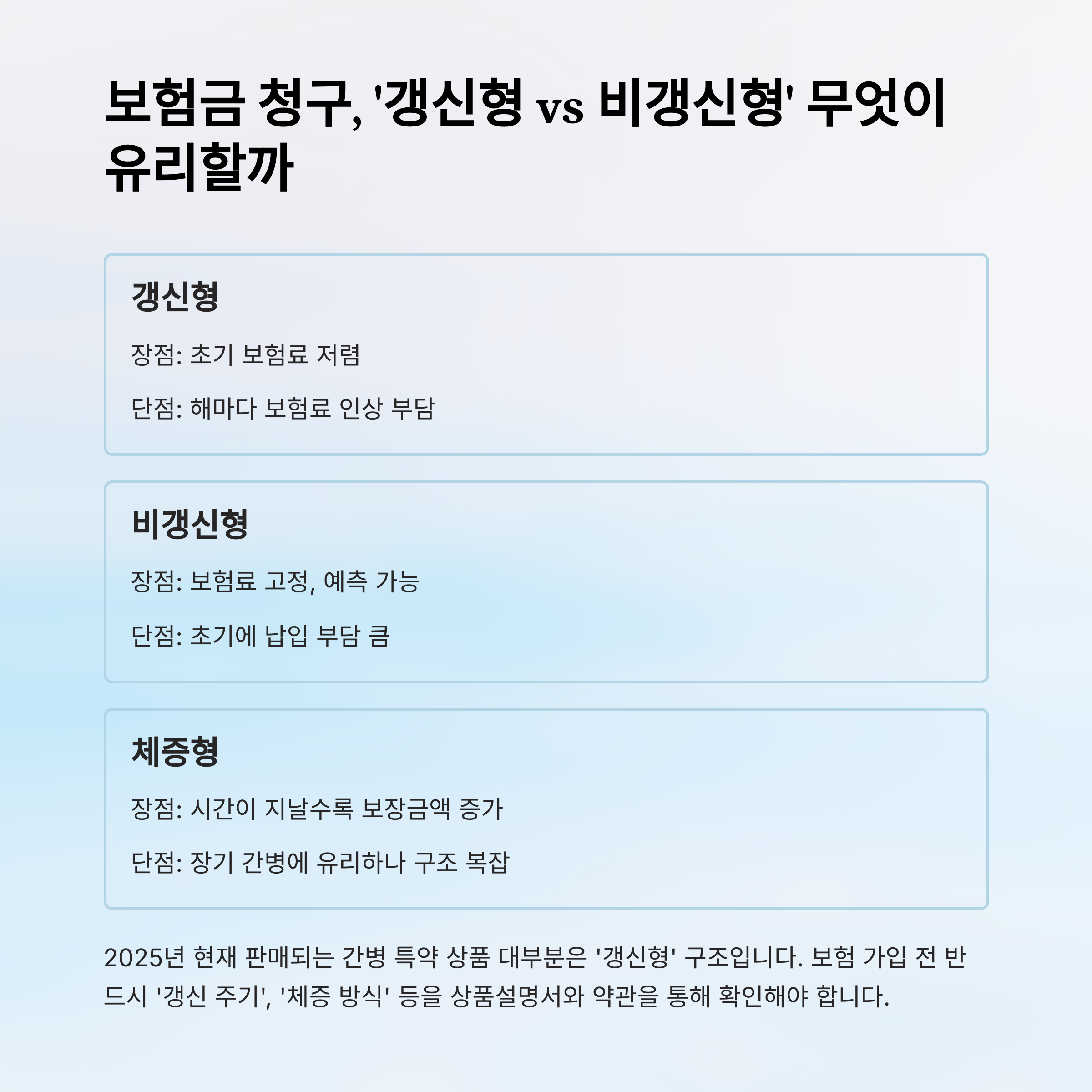 2025년 현재 판매되는 간병 특약 상품 대부분은 ‘갱신형’ 구조입니다.