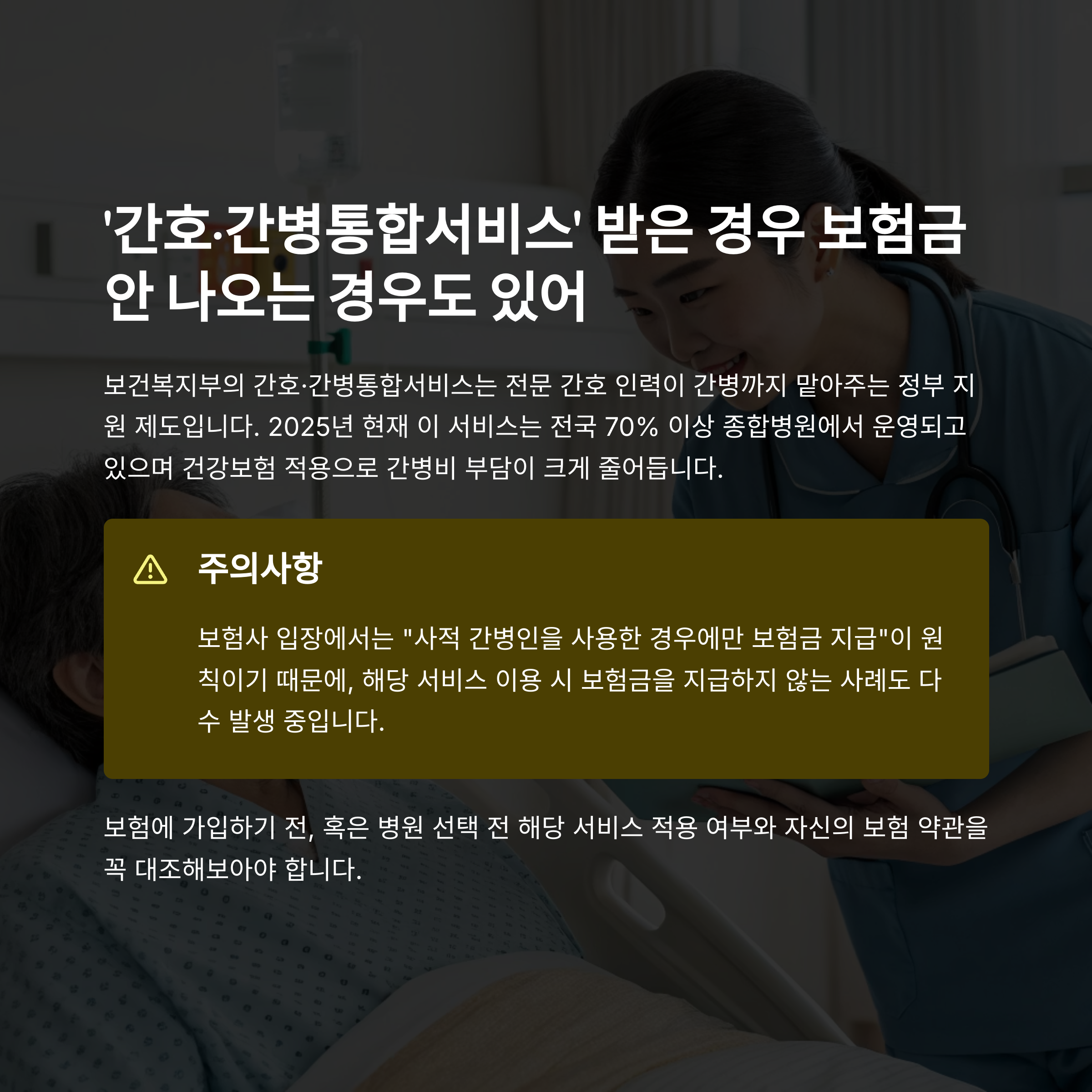 즉, 입원 치료는 건강보험이 적용되지만 간병은 전액 본인 부담이라는 뜻입니다.