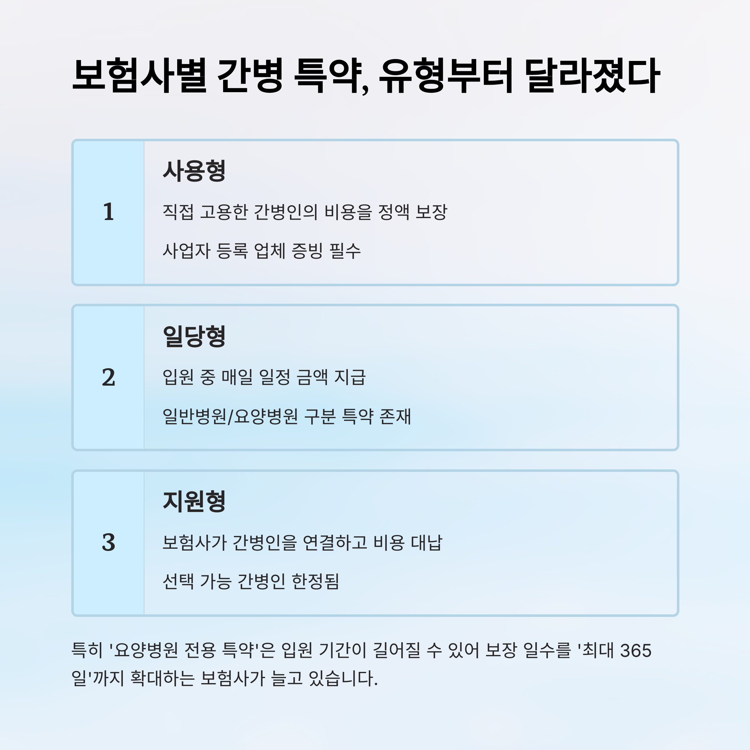 | 지원형 | 보험사가 간병인을 연결하고 비용 대납 | 선택 가능 간병인 한정됨 |