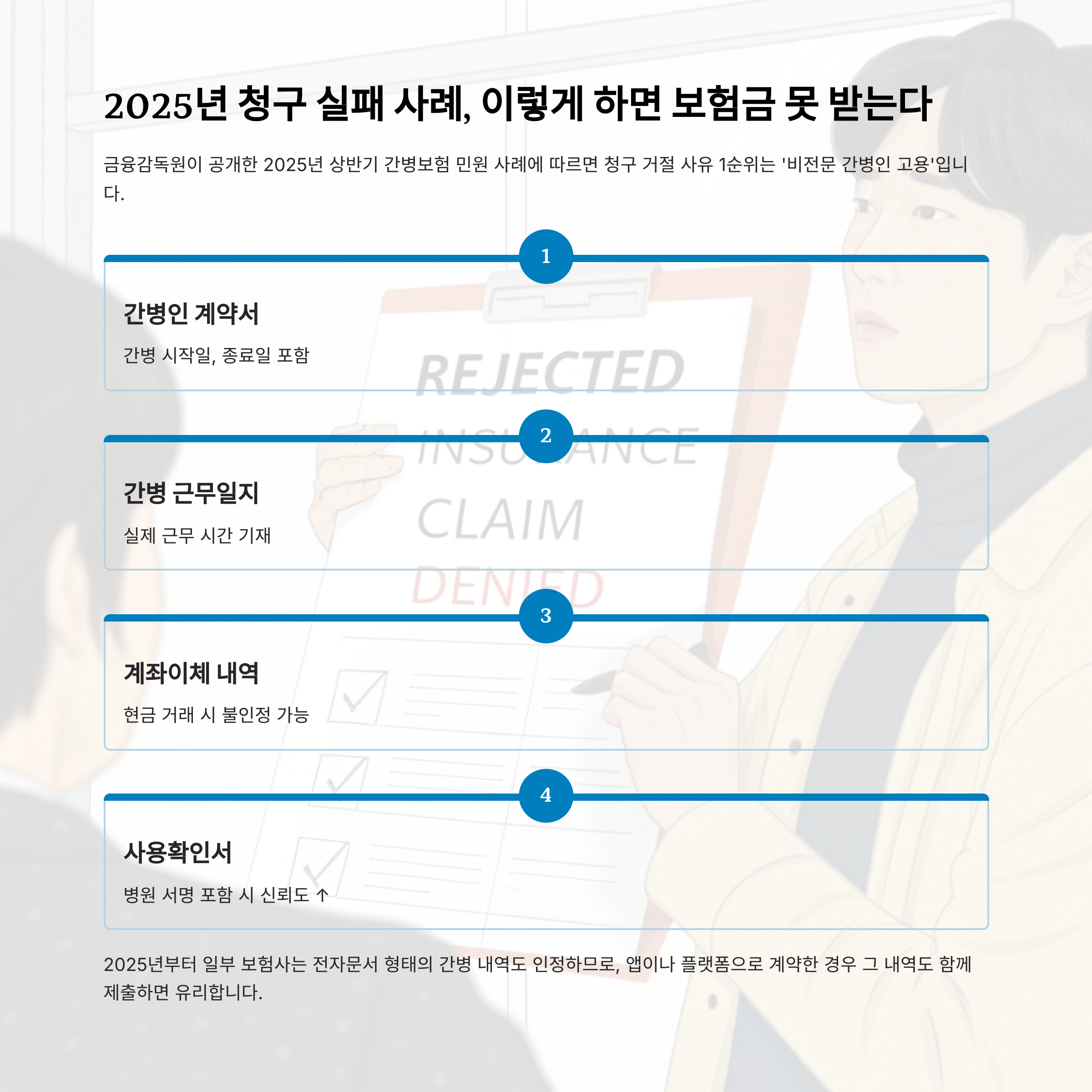 청구 거절 사유 1순위는 ‘비전문 간병인 고용’입니다.