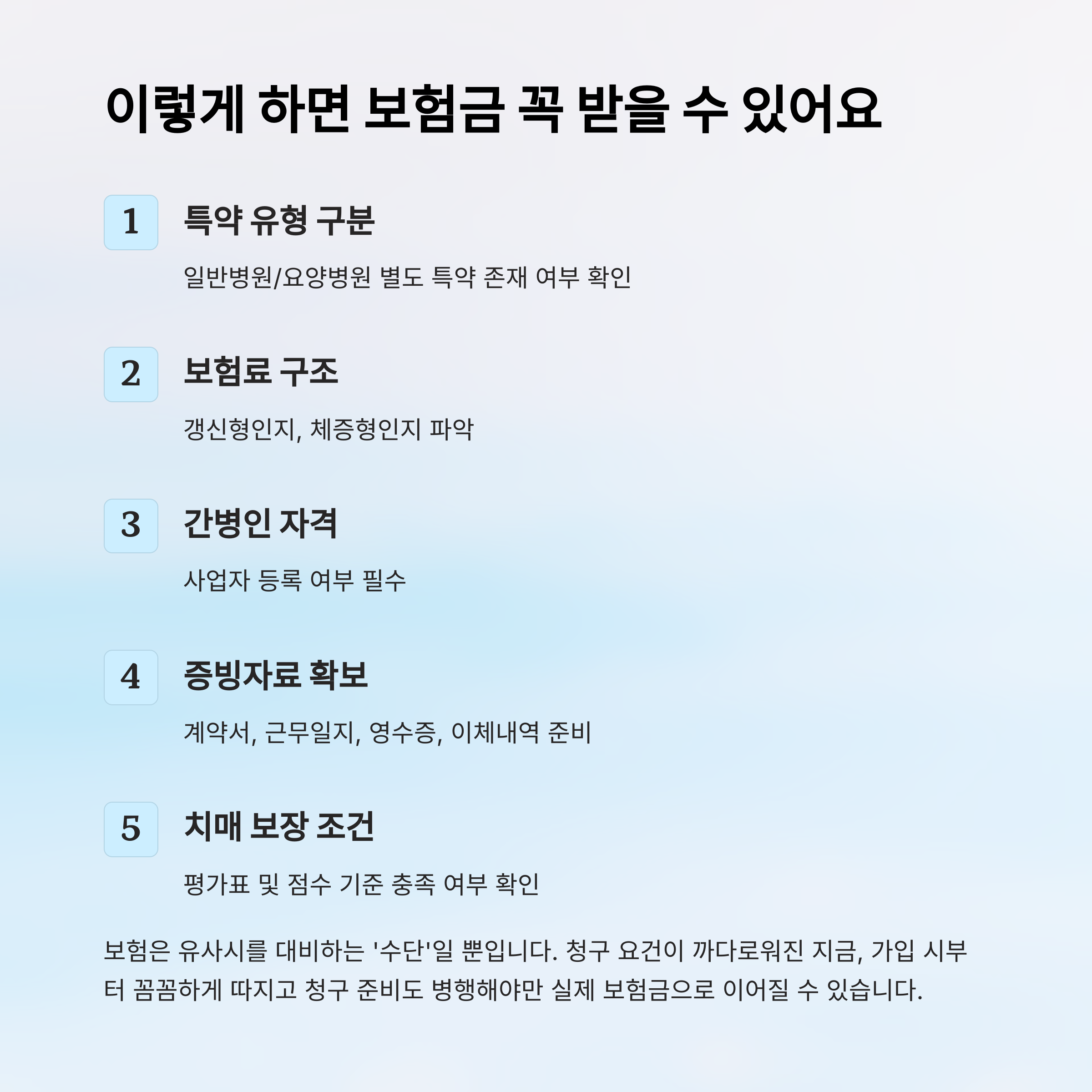 2025년 기준 간병인 보험을 제대로 활용하려면 다음과 같은 실전 팁이 중요합니다.