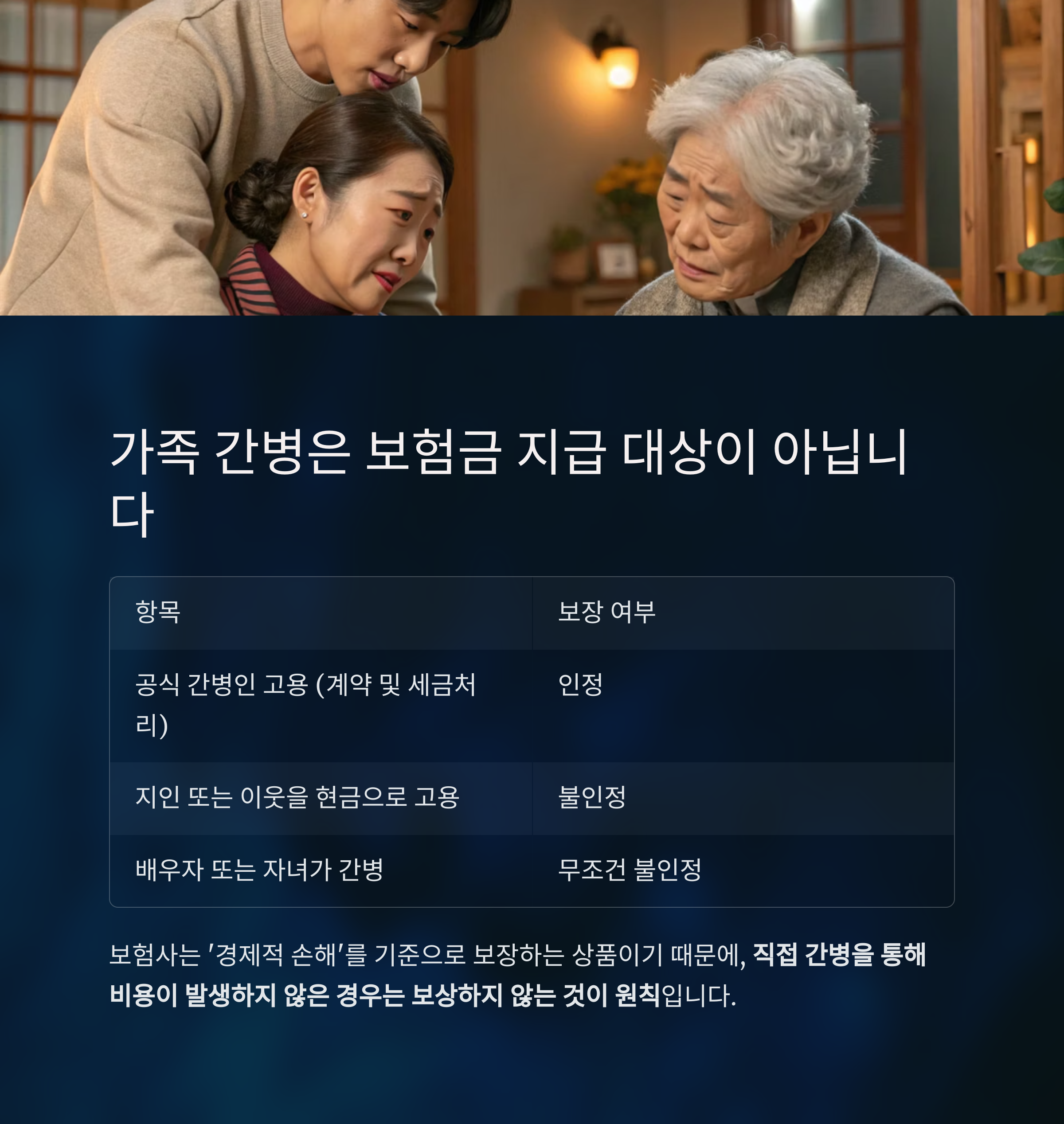 중요: 보험사는 ‘질병’이 아닌 ‘간병의 기준’에 따라 판단합니다.
