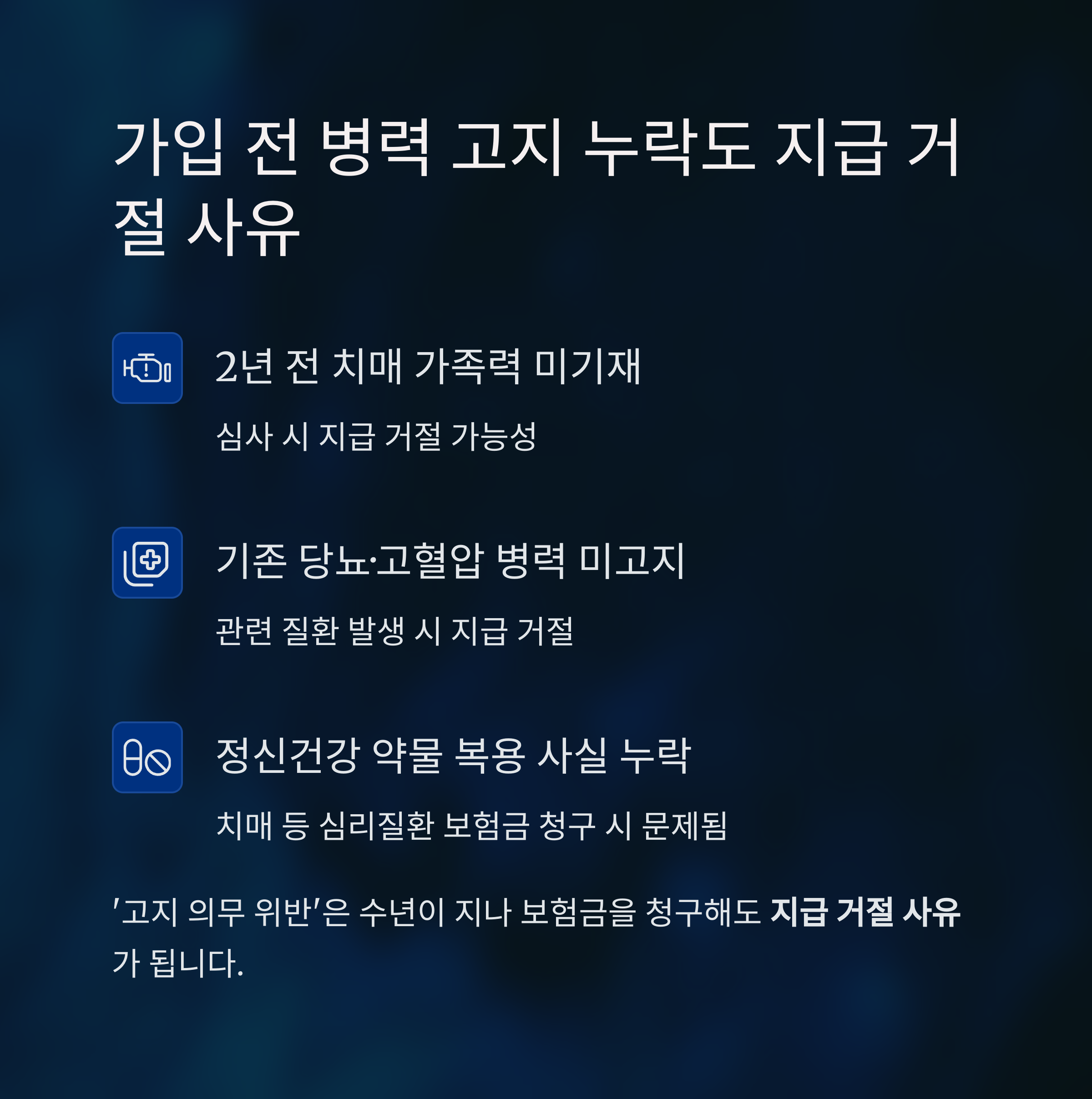 | 정신건강 약물 복용 사실 누락 | 치매 등 심리질환 보험금 청구 시 문제됨 |
