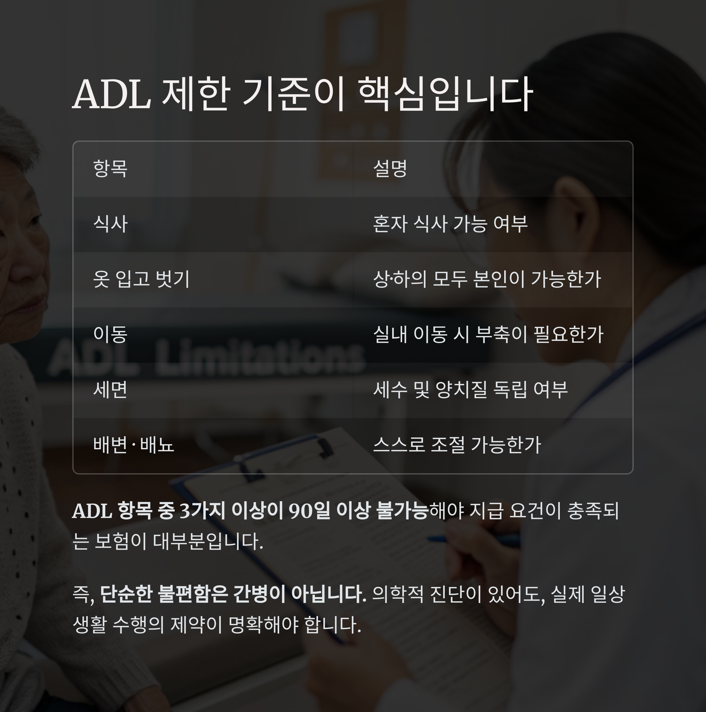 ADL 항목 중 3가지 이상이 90일 이상 불가능해야 지급 요건이 충족되는 보험이 대부분입니다.