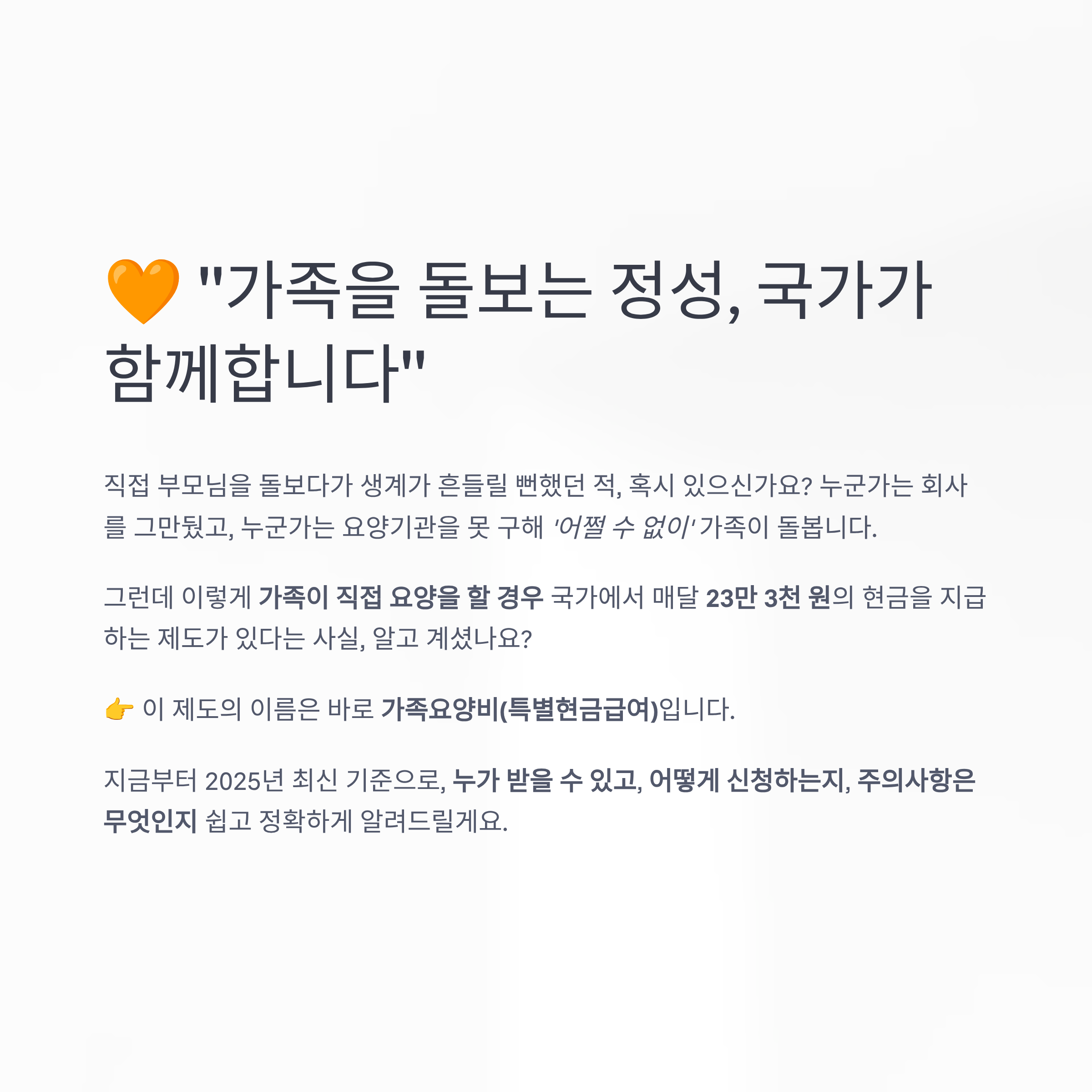 ๋ถ€๋ชจ๋‹˜์„ ์ง์ ‘ ๋Œ๋ณธ๋‹ค๋ฉด ๋งค๋‹ฌ 23๋งŒ ์› ๋ฐ›์„ ์ˆ˜ ์žˆ๋‹ค? ๋ชฐ๋ผ์„œ ๋ชป ๋ฐ›๋Š” '๊ฐ€์กฑ์š”์–‘๋น„' ์ œ๋„ ์™„์ „ ์ •๋ฆฌ!
