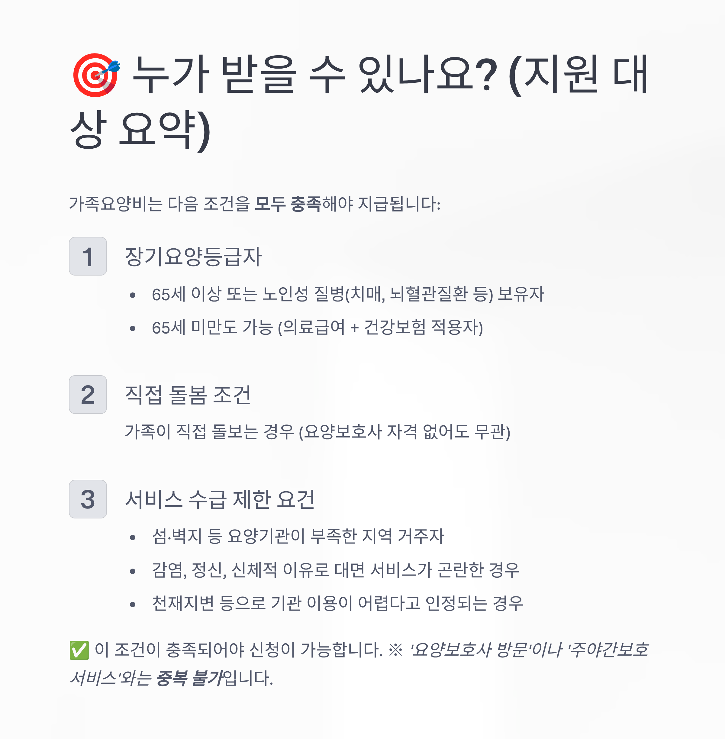 โŒ ์ค‘๋ณต ์ˆ˜๊ธ‰ ์—ฌ๋ถ€ ๋‹ค๋ฅธ ์žฅ๊ธฐ์š”์–‘ ์„œ๋น„์Šค์™€ ์ค‘๋ณต ์ˆ˜๊ธ‰ ๋ถˆ๊ฐ€ (๋ฐฉ๋ฌธ๋ชฉ์š•, ์ฃผ์•ผ๊ฐ„๋ณดํ˜ธ ๋“ฑ)