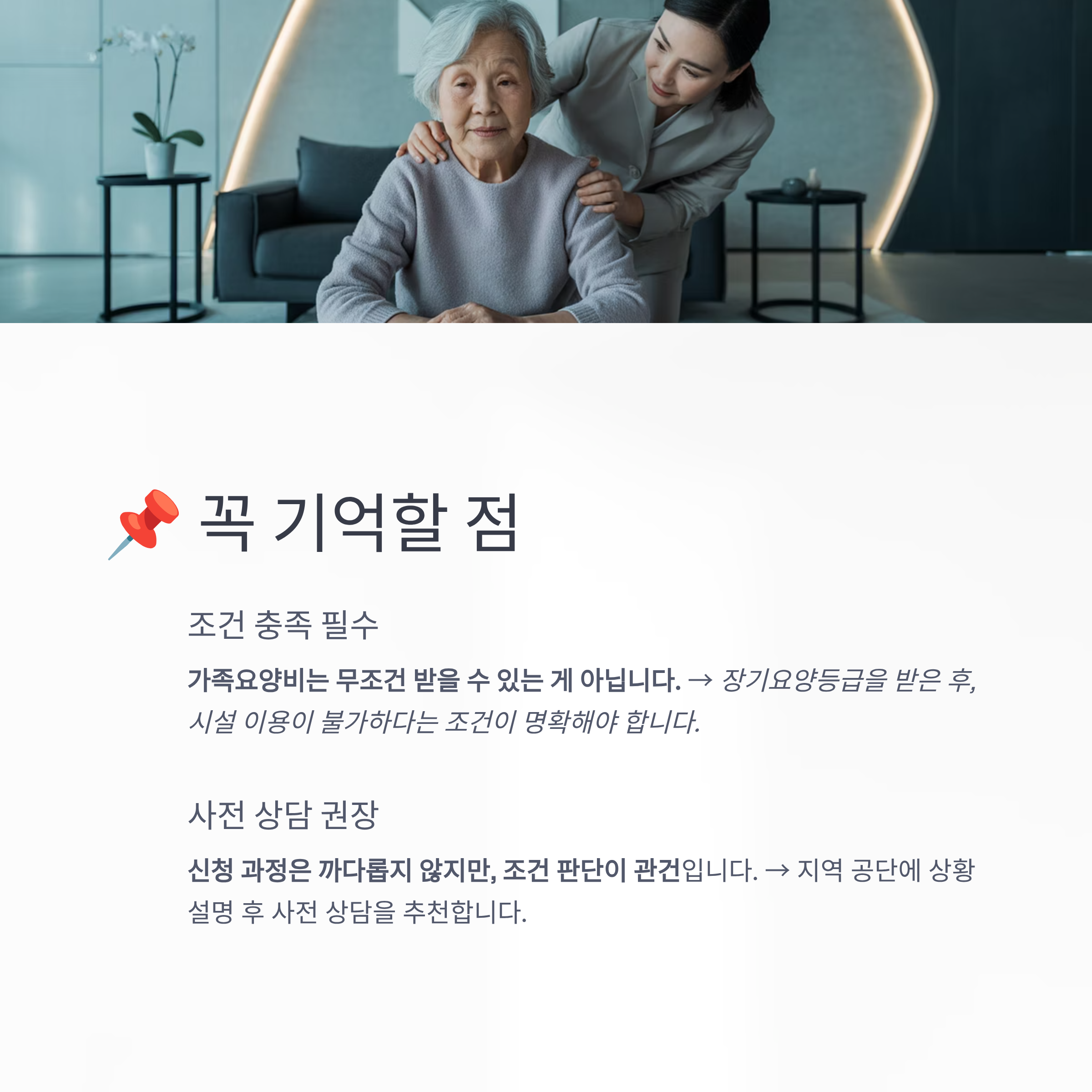 → ์žฅ๊ธฐ์š”์–‘๋“ฑ๊ธ‰์„ ๋ฐ›์€ ํ›„, ์‹œ์„ค ์ด์šฉ์ด ๋ถˆ๊ฐ€ํ•˜๋‹ค๋Š” ์กฐ๊ฑด์ด ๋ช…ํ™•ํ•ด์•ผ ํ•ฉ๋‹ˆ๋‹ค.