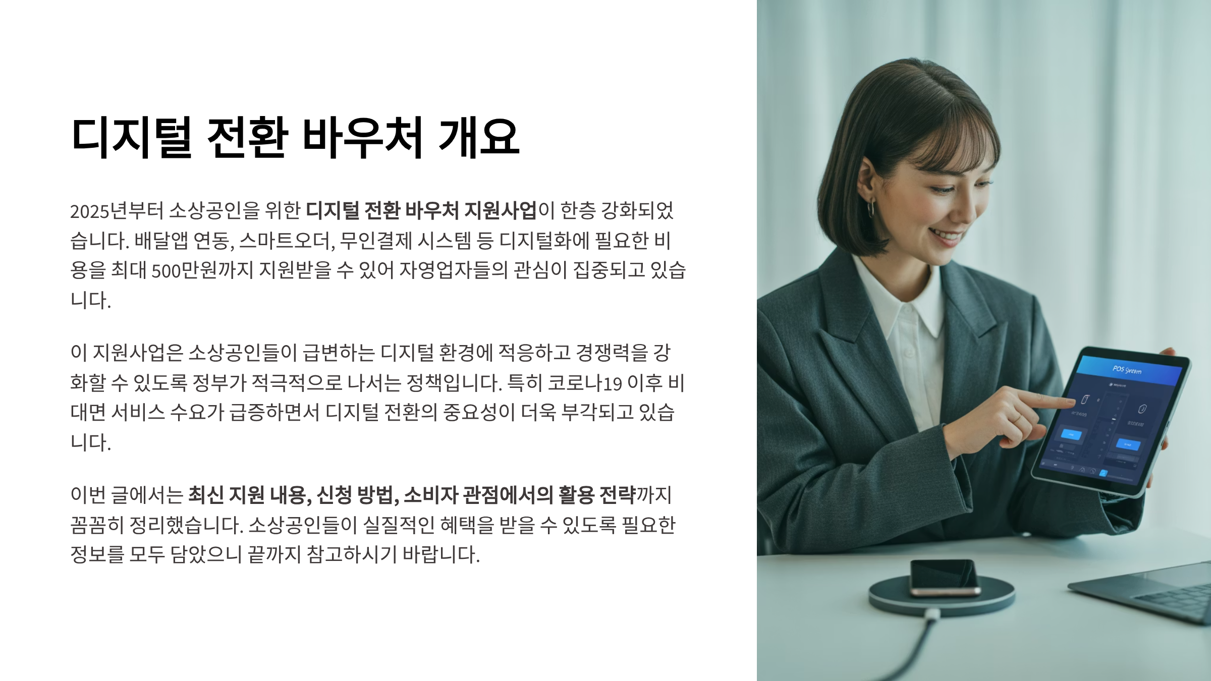 2025년부터 소상공인을 위한 디지털 전환 바우처 지원사업이 한층 강화되었습니다. 배달앱 연동, 스마트오더, 무인결제 시스템 등 디지털화에 필요한 비용을 최대 500만원까지 지원받을 수 있어 자영업자들의 관심이 집중되고 있습니다. 이번 글에서는 최신 지원 내용, 신청 방법, 소비자 관점에서의 활용 전략까지 꼼꼼히 정리했습니다.
