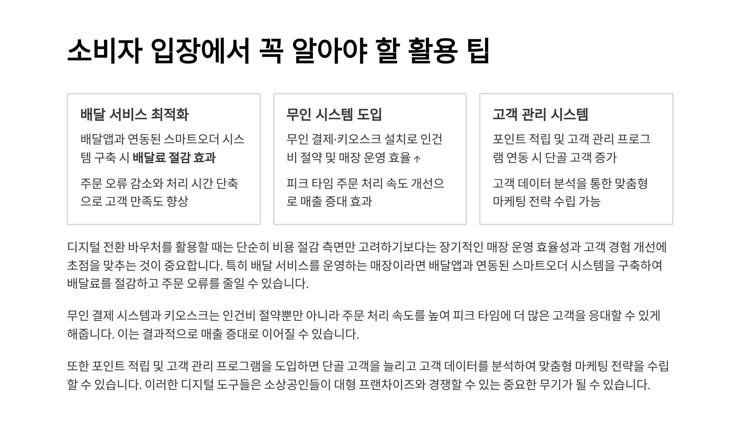- 무인 결제·키오스크 설치로 인건비 절약 및 매장 운영 효율 ↑