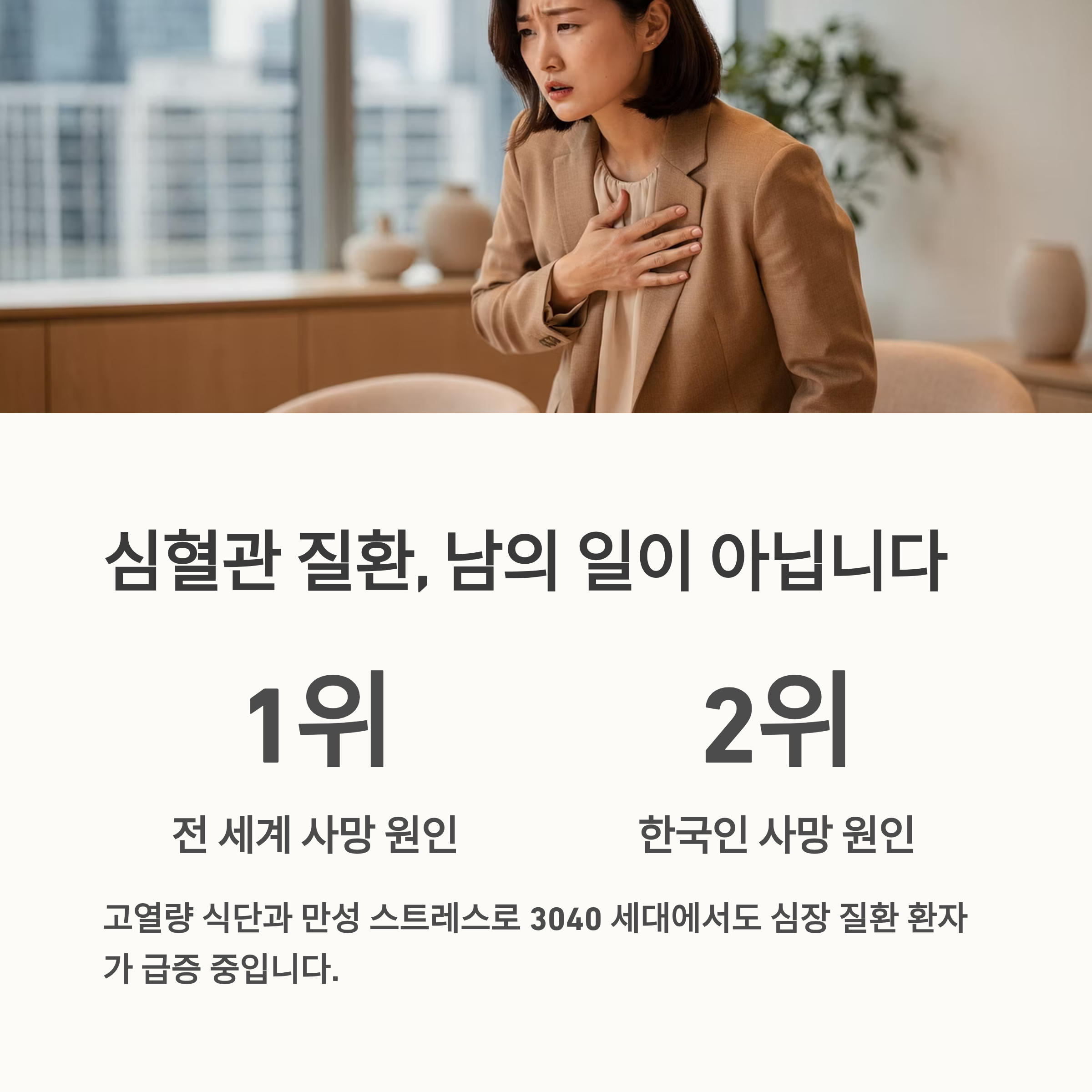 전 세계 사망 원인 1위, 한국인 사망 원인 2위가 바로 심혈관 질환입니다. 특히 현대인은 고열량 식단과 만성 스트레스로 인해 3040 세대에서도 심장 질환 환자가 급증하고 있습니다. 영양제는 치료제는 아니지만, 올바른 선택은 심장 근육을 강화하고 혈관 벽을 깨끗하게 유지하는 강력한 방패가 됩니다.