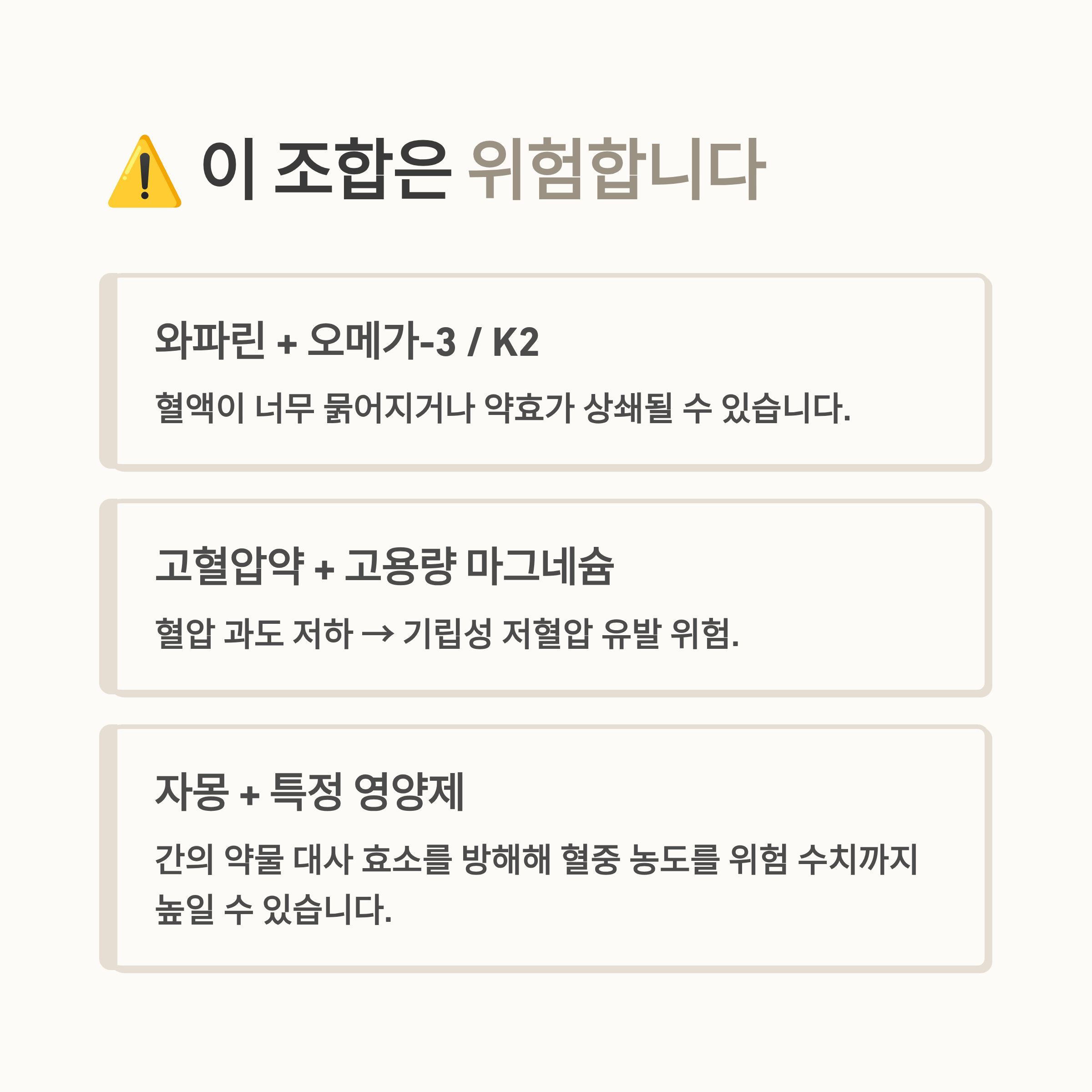 - 와파린(항응고제) + 오메가-3 / 비타민 K: 혈액이 너무 묽어져 지혈이 안 되거나, 반대로 약효가 상쇄될 수 있습니다.