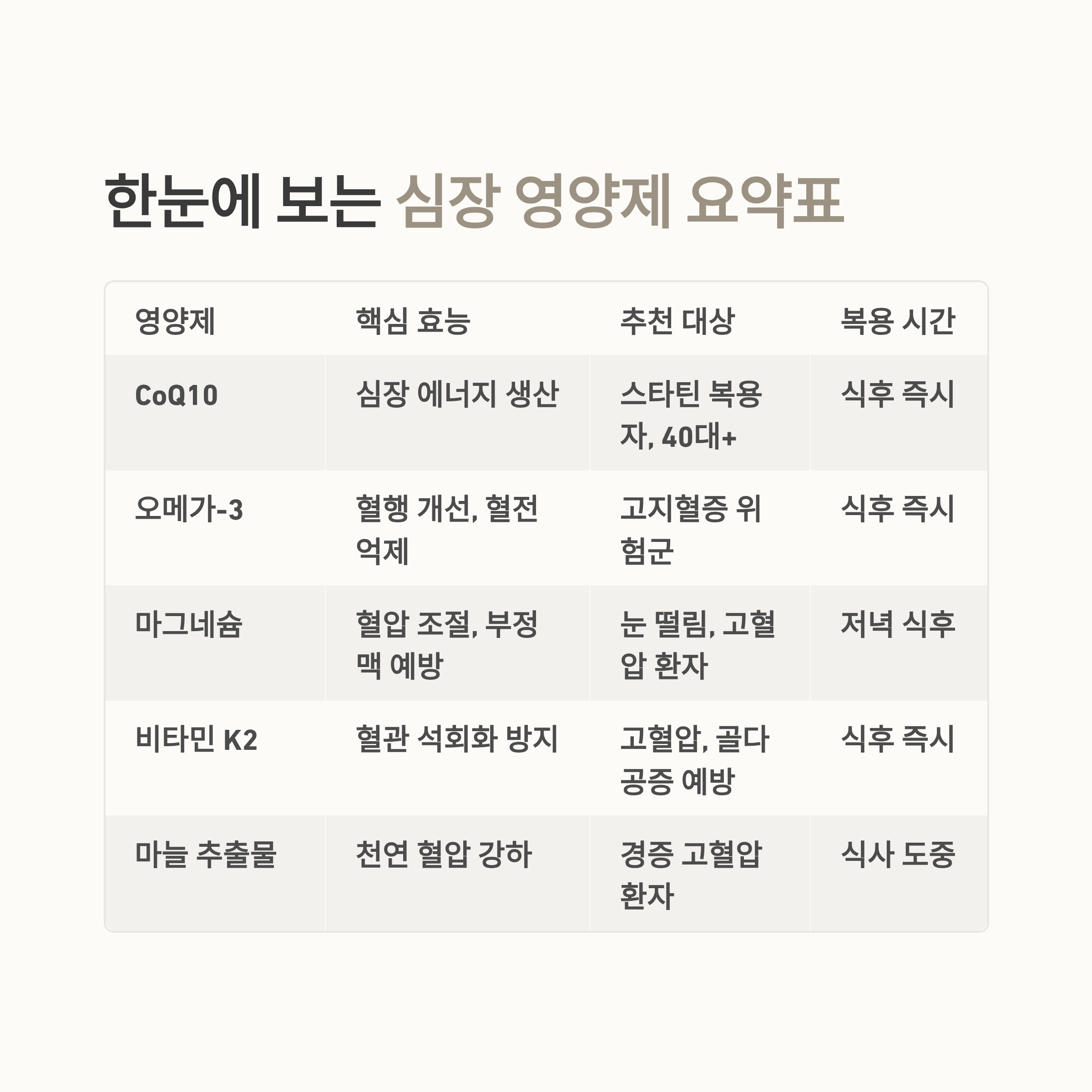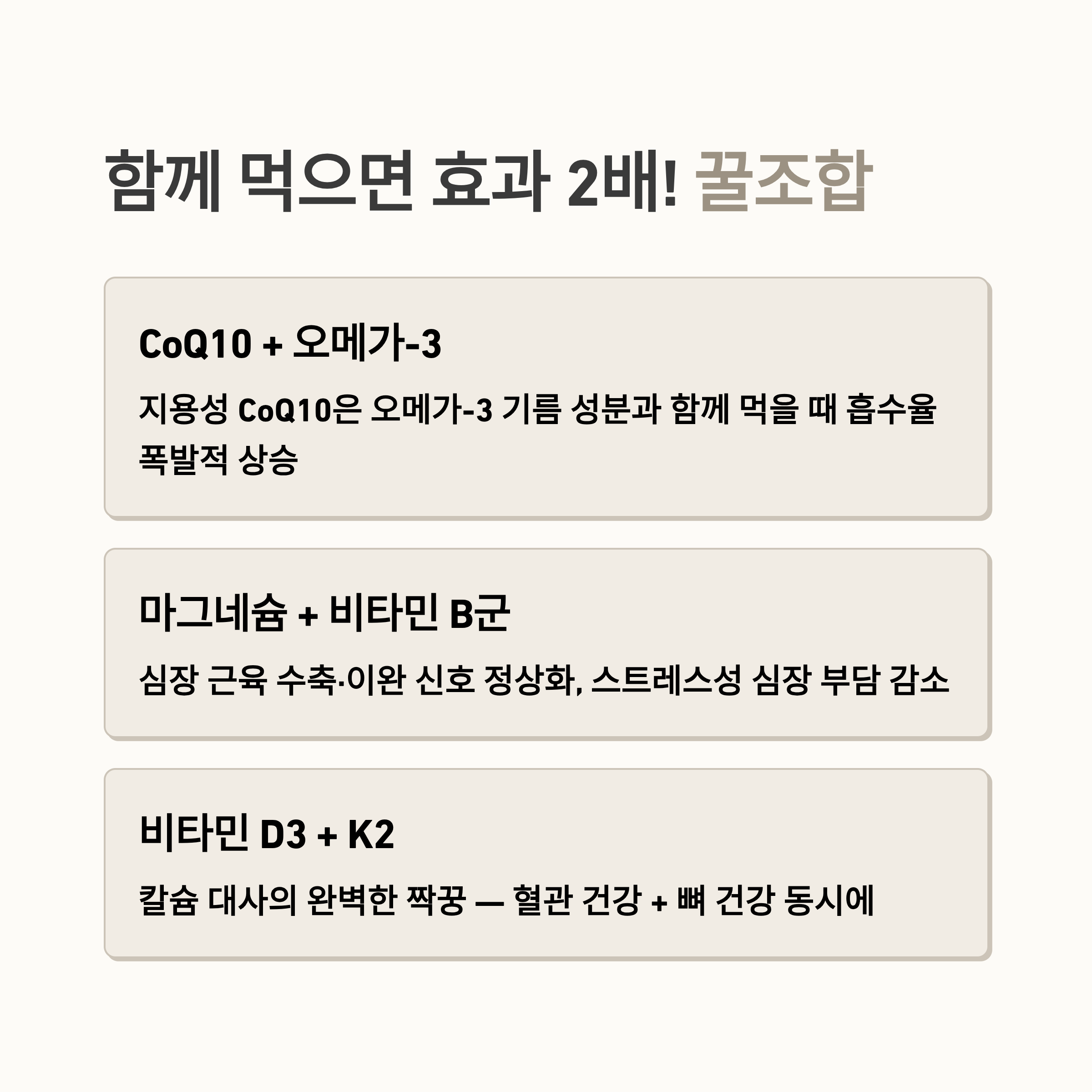 | CoQ10 | 심장 에너지 생산 | 스타틴 복용자, 40대 이상 | 식후 즉시 |