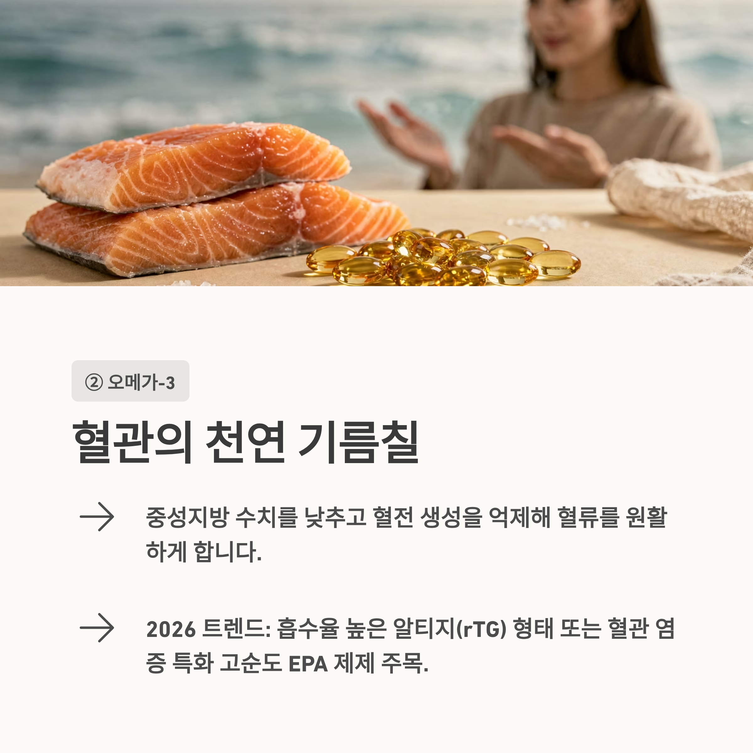 - 2026 트렌드: 최근에는 일반 오메가-3보다 흡수율이 높은 '알티지(rTG)' 형태나, 혈관 염증에 특화된 '고순도 EPA' 제제가 각광받고 있습니다.