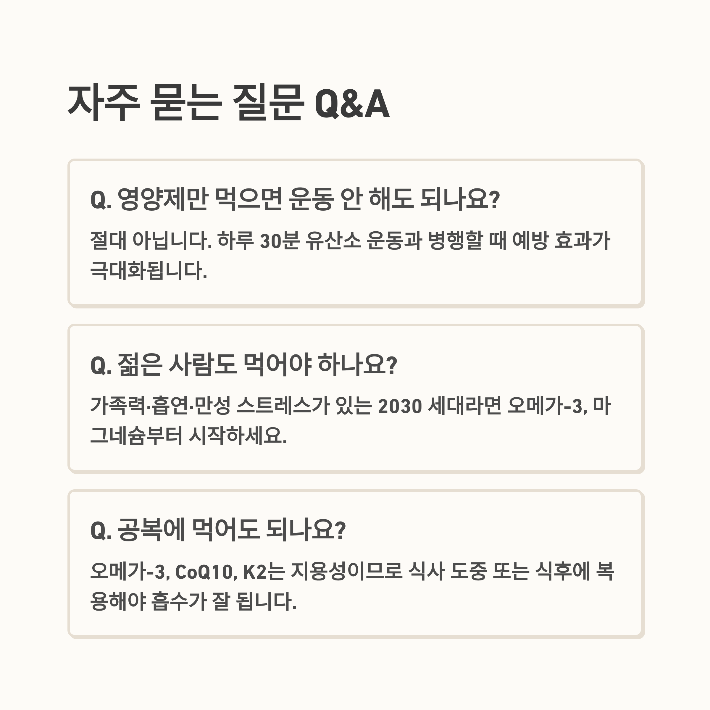 A3. 대부분의 심장 영양제(오메가-3, CoQ10, K2)는 지용성이므로 식사 도중이나 식사 직후에 드셔야 흡수가 잘 됩니다.