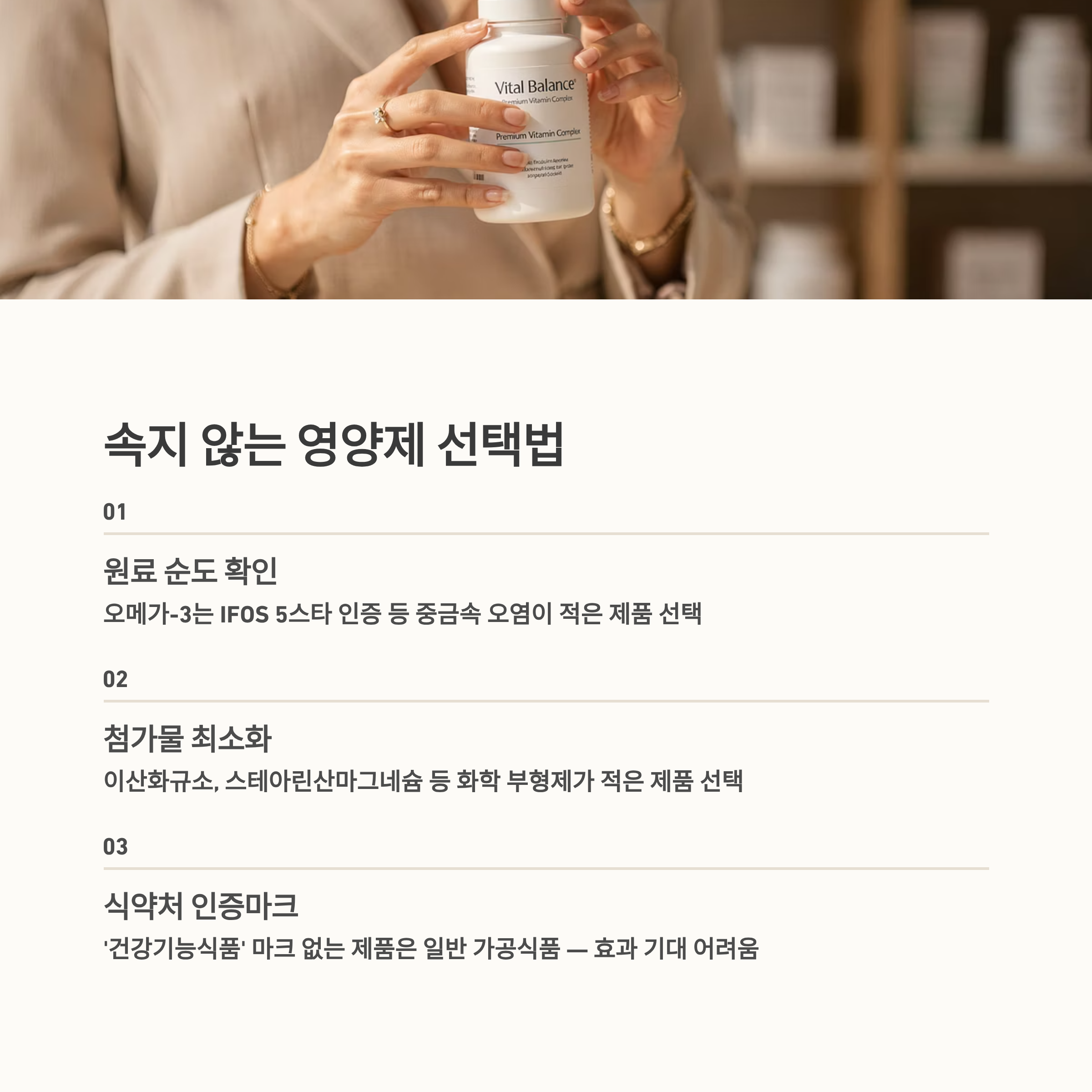 - 원료의 순도 확인: 오메가-3는 IFOS 5스타 인증 등 중금속 오염이 적은 제품인지 확인하세요.