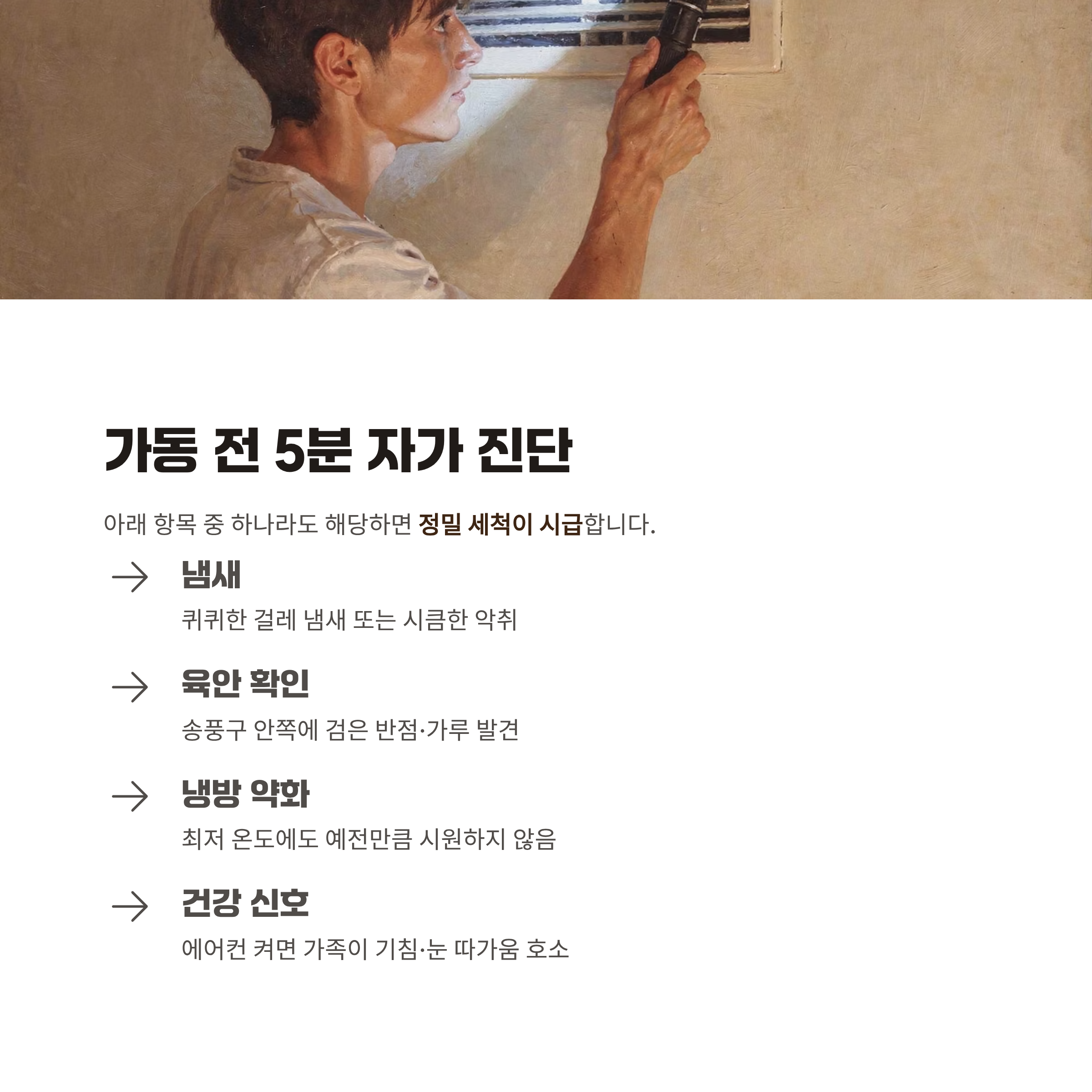 업체를 부르기 전, 소비자 입장에서 직접 확인할 수 있는 체크리스트입니다. 아래 항목 중 하나라도 해당한다면 정밀 세척이 시급합니다.